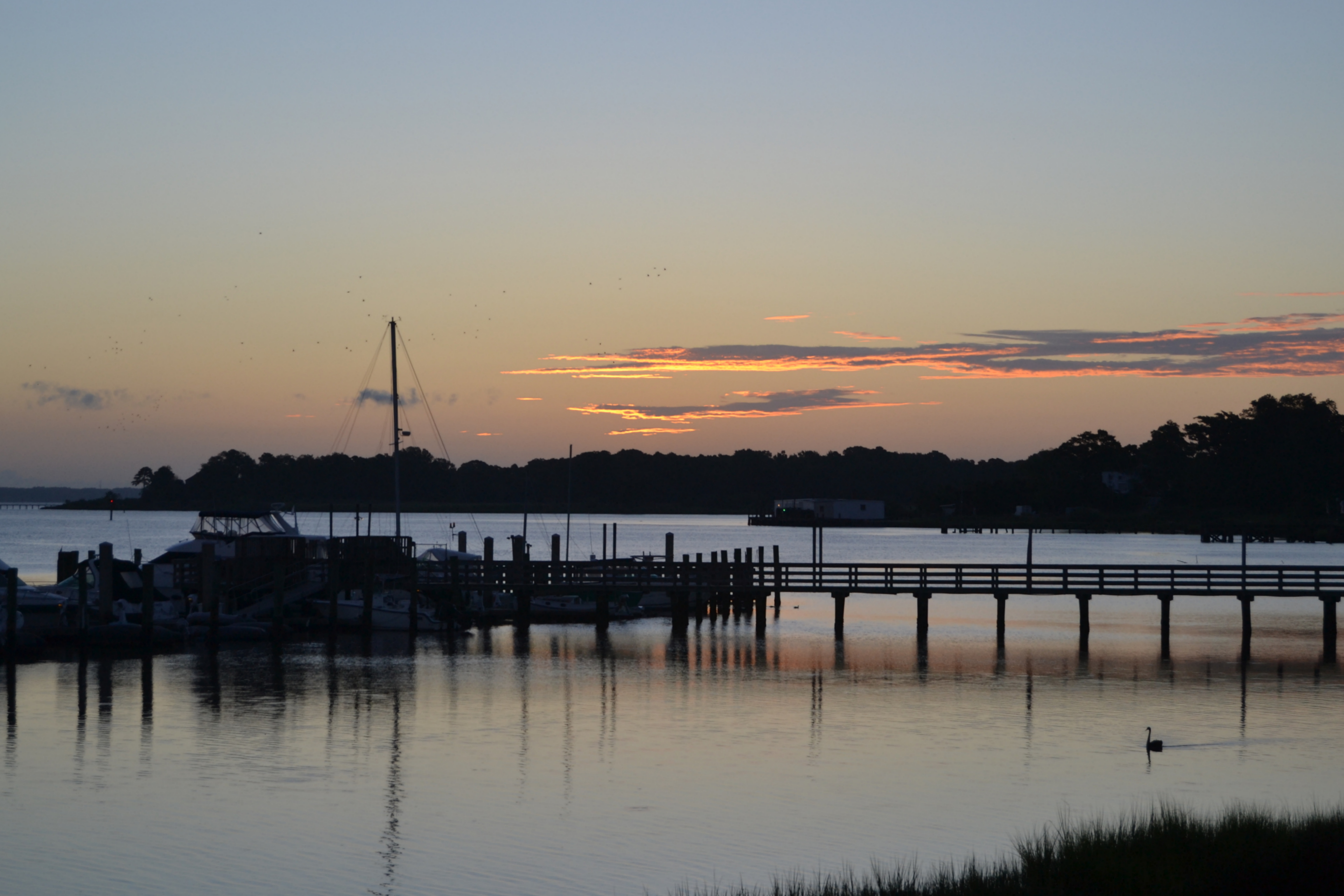 August 5. A subtle sky at dawn. And Groom Swan, swimming in for breakfast.
