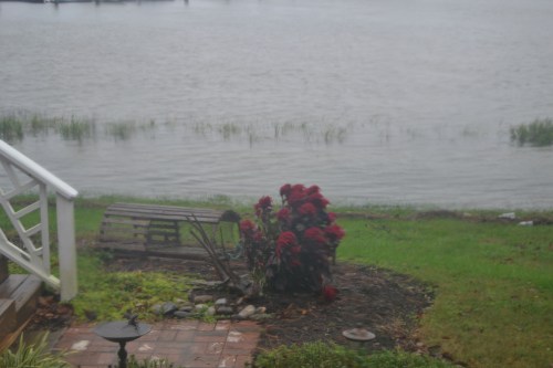 This was taken yesterday morning (through our bedroom window). You can see from the trash in the yard, that the tide had receded just a little at this point.