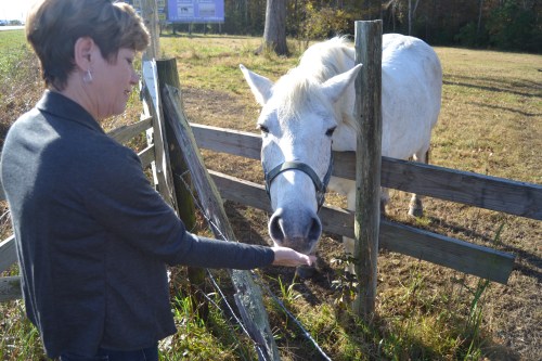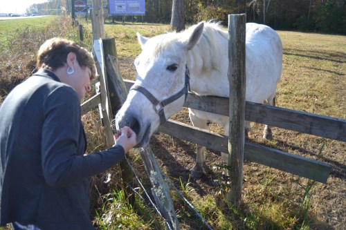 You may recall my post from a couple weeks ago about Aggie, the white horse that we see on our trips to and from the Outer Banks. At the end of that post, I promised that we’d have treats for her the next time we passed by her pasture.