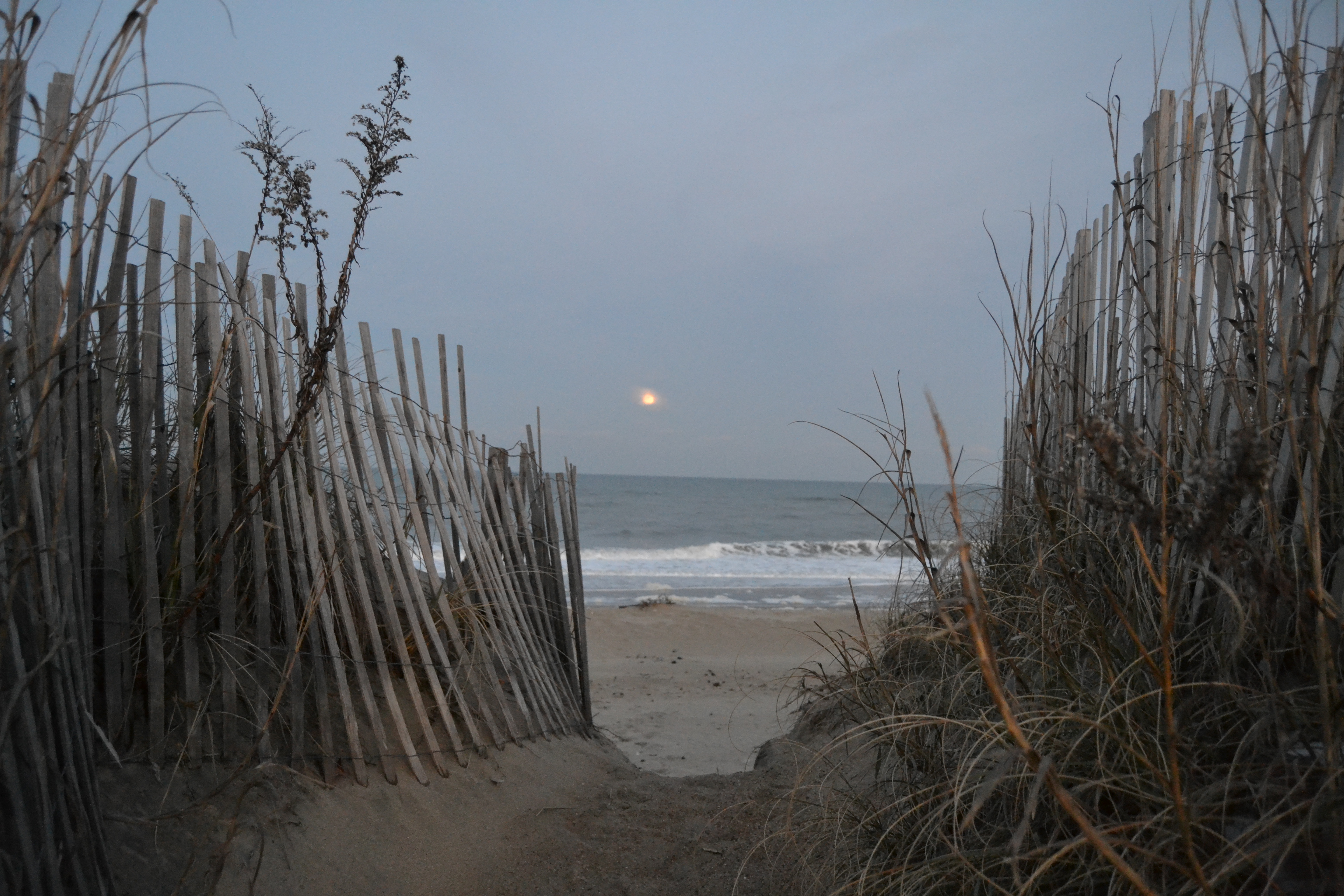 And, a little later, sand fences with a moonrise-over-the-ocean backdrop.