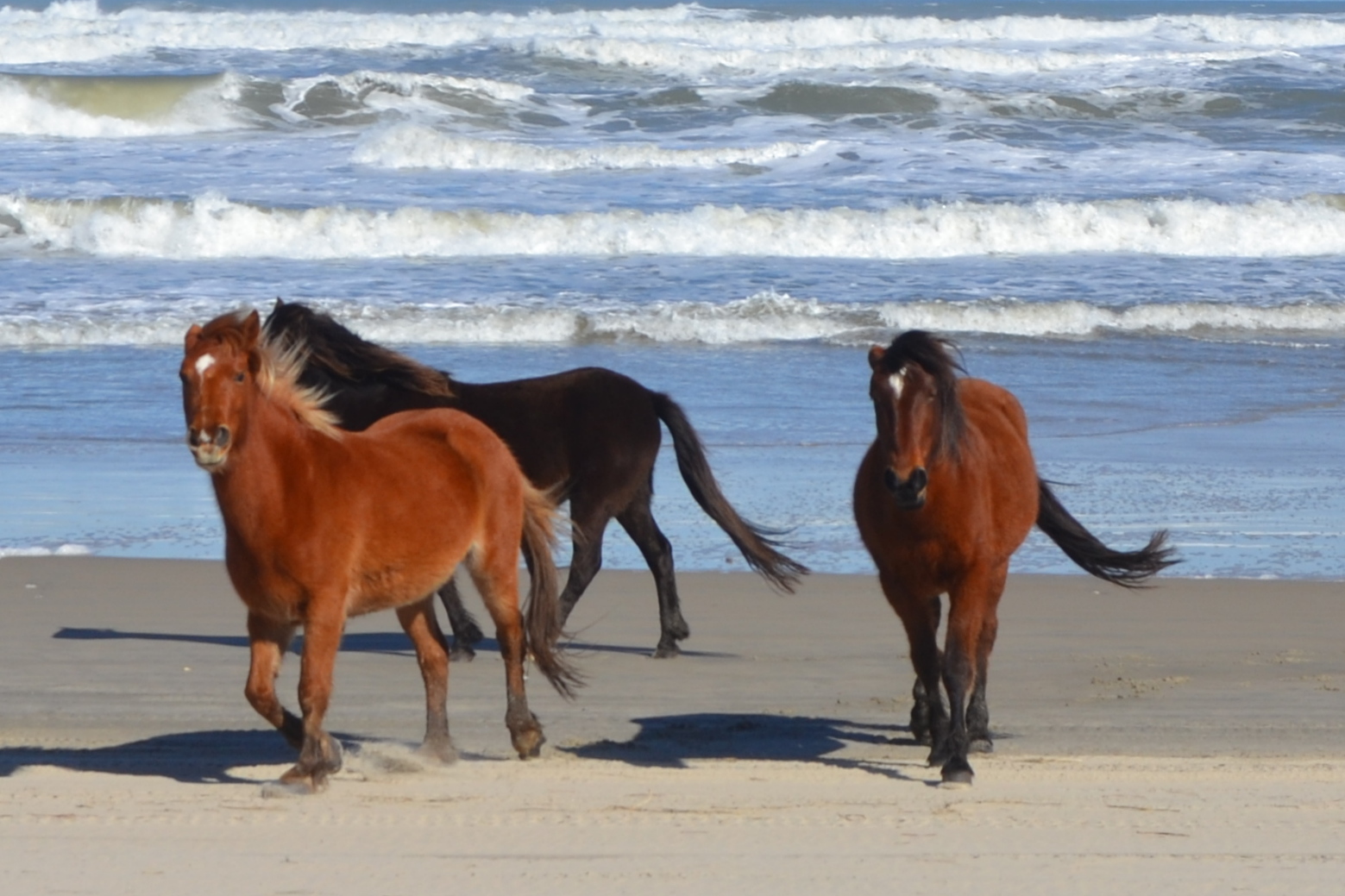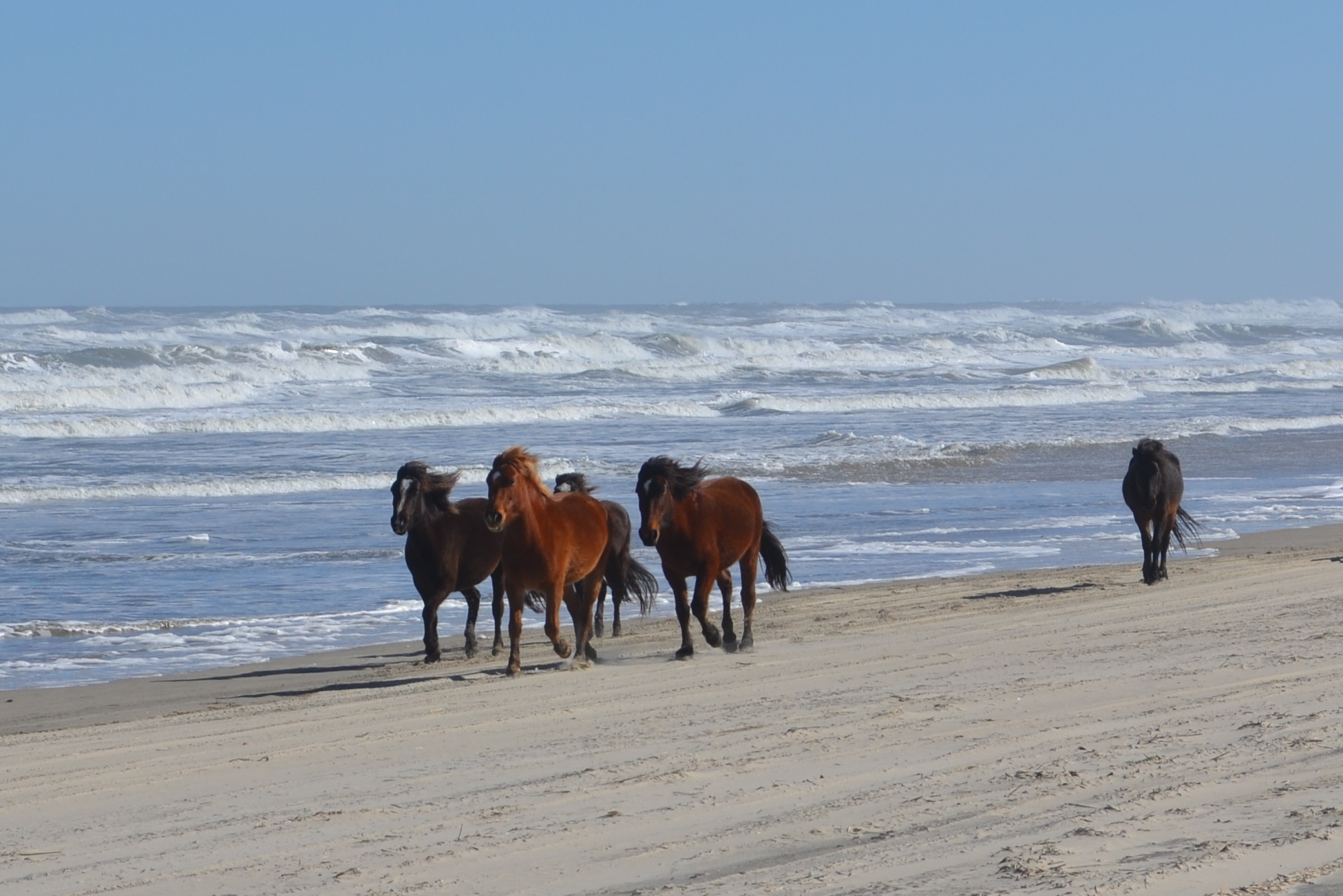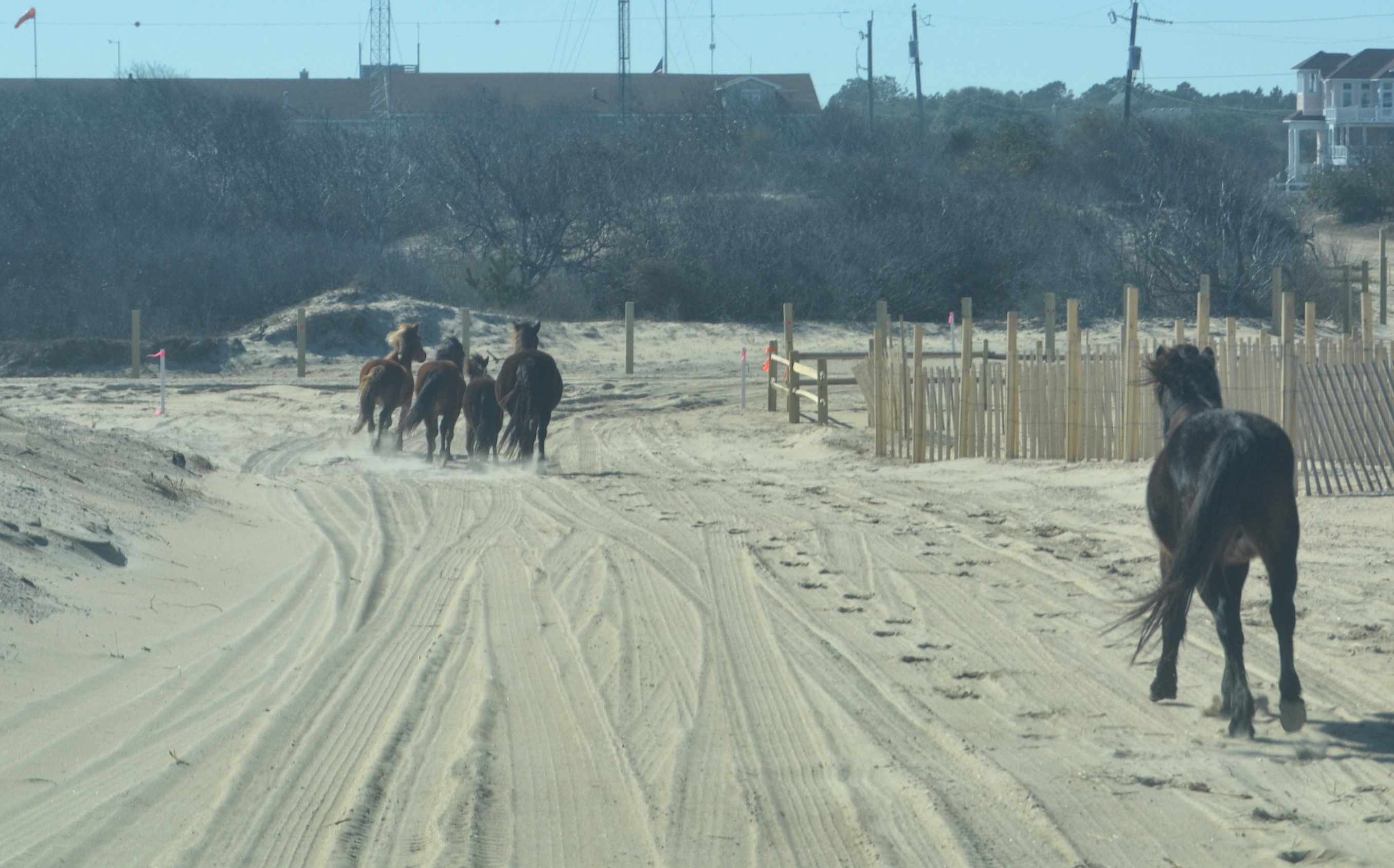 Finally, they decided they’d had enough beach time and took an “exit” down a side road. This picture was taken through the windshield, so the color is a bit off. I cropped it to make the horses easier to see; we weren’t this close. But it was quite a thrill to watch them all running.