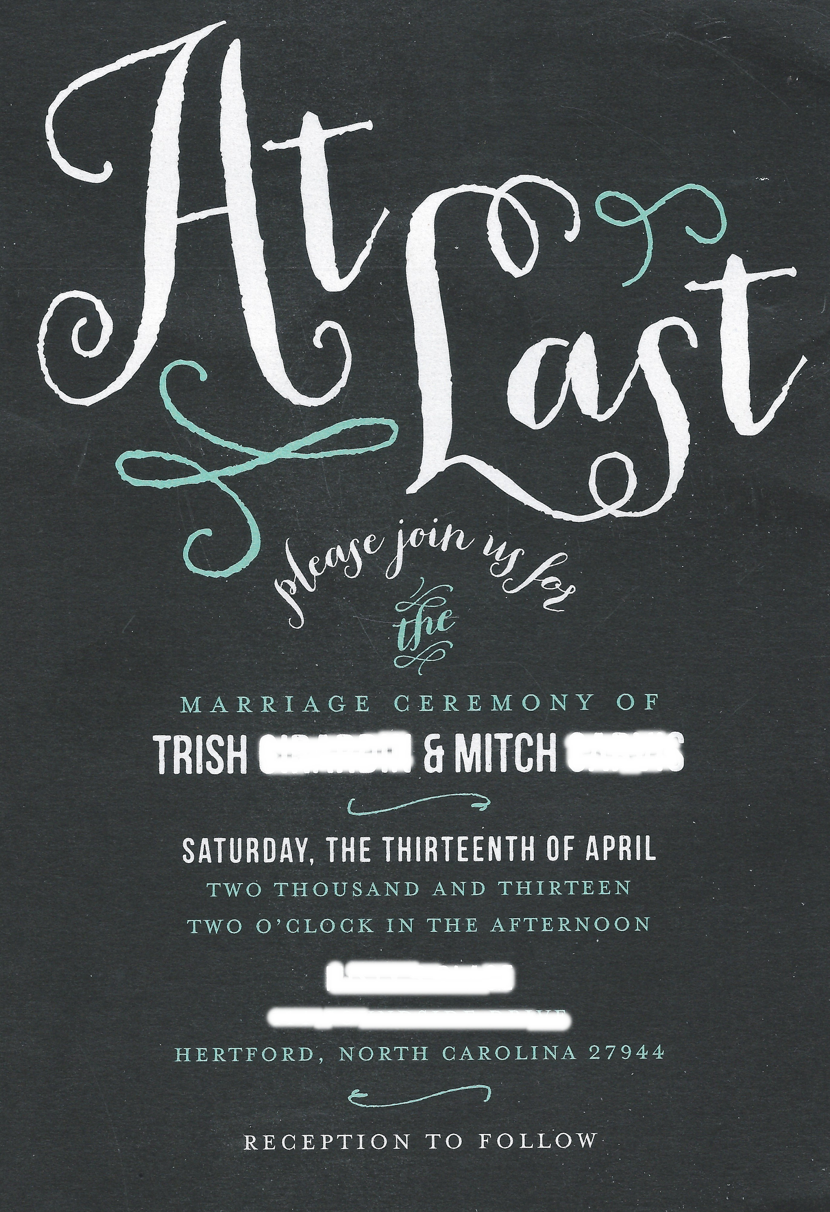 Motor Man and I attended a wedding Saturday afternoon. He met Mitch, the groom, at our local race track back in the 70’s. Mitch and Trish, his bride, have been a couple for….18 (yes, 18) years. Earlier this year, they announced that they would be marrying in April. This was their wedding invitation: