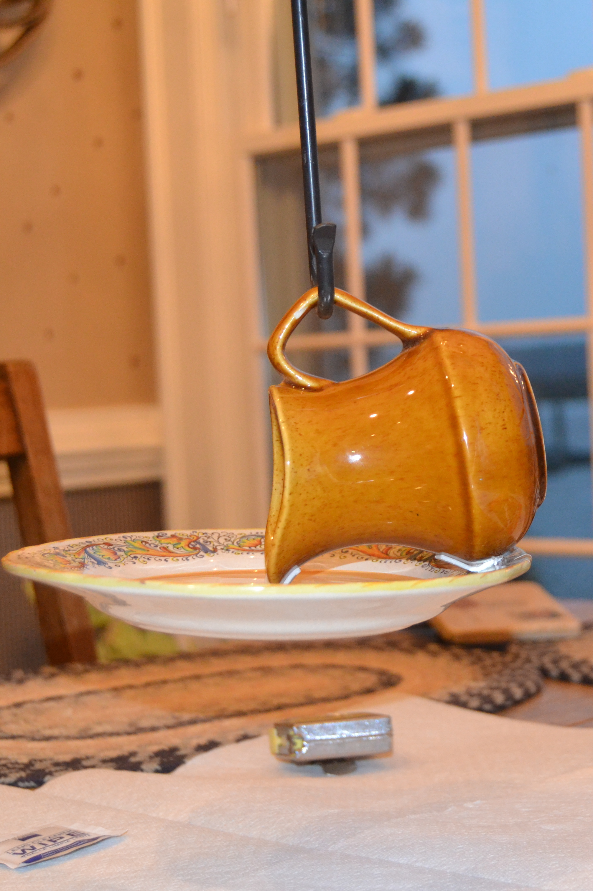 First we needed to find the center of gravity, so the feeder would hang level. We attached the tape to the creamer and placed it on the saucer. Then I held it up, using the hanger, and we moved the creamer until the feeder would hang correctly.  Motor Man marked where the creamer should be placed on the saucer.  (Now I remember that this step made the tape measure unnecessary. Lesson learned from bird feeder #1.)