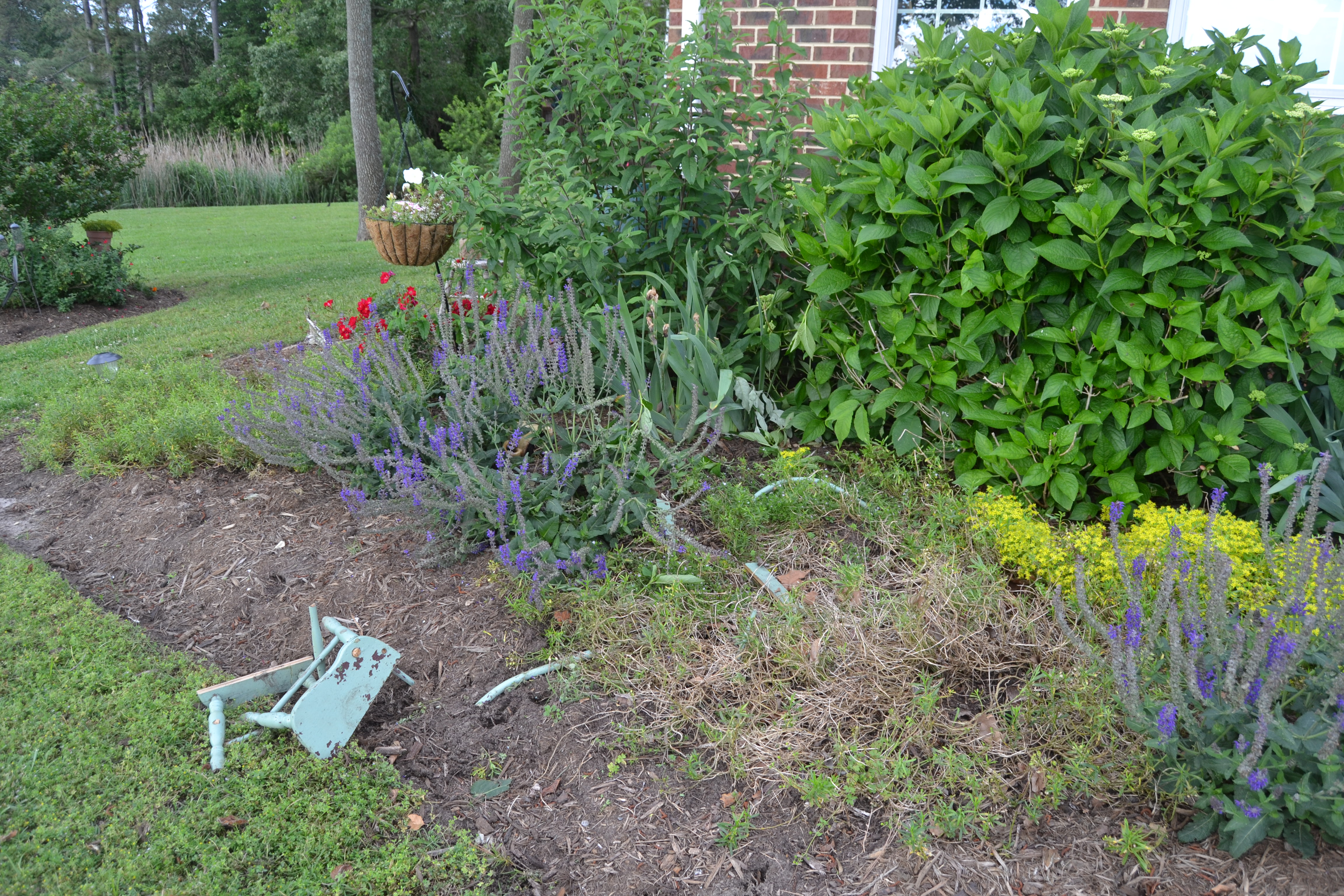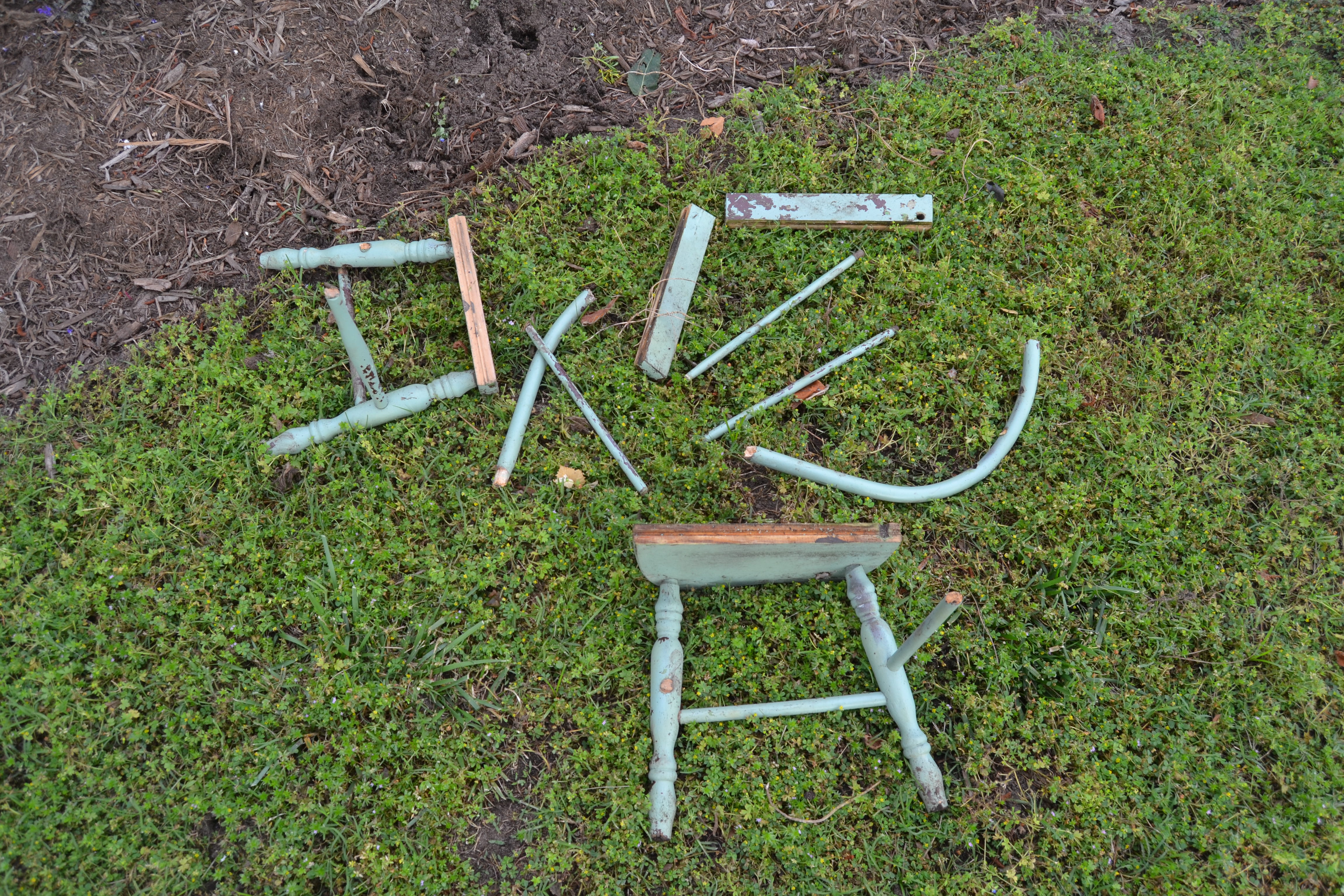 And it stopped me in my tracks. One of my little chairs, broken into several pieces. It was originally in the flowerbed, just to the left of that yellow blooming plant.