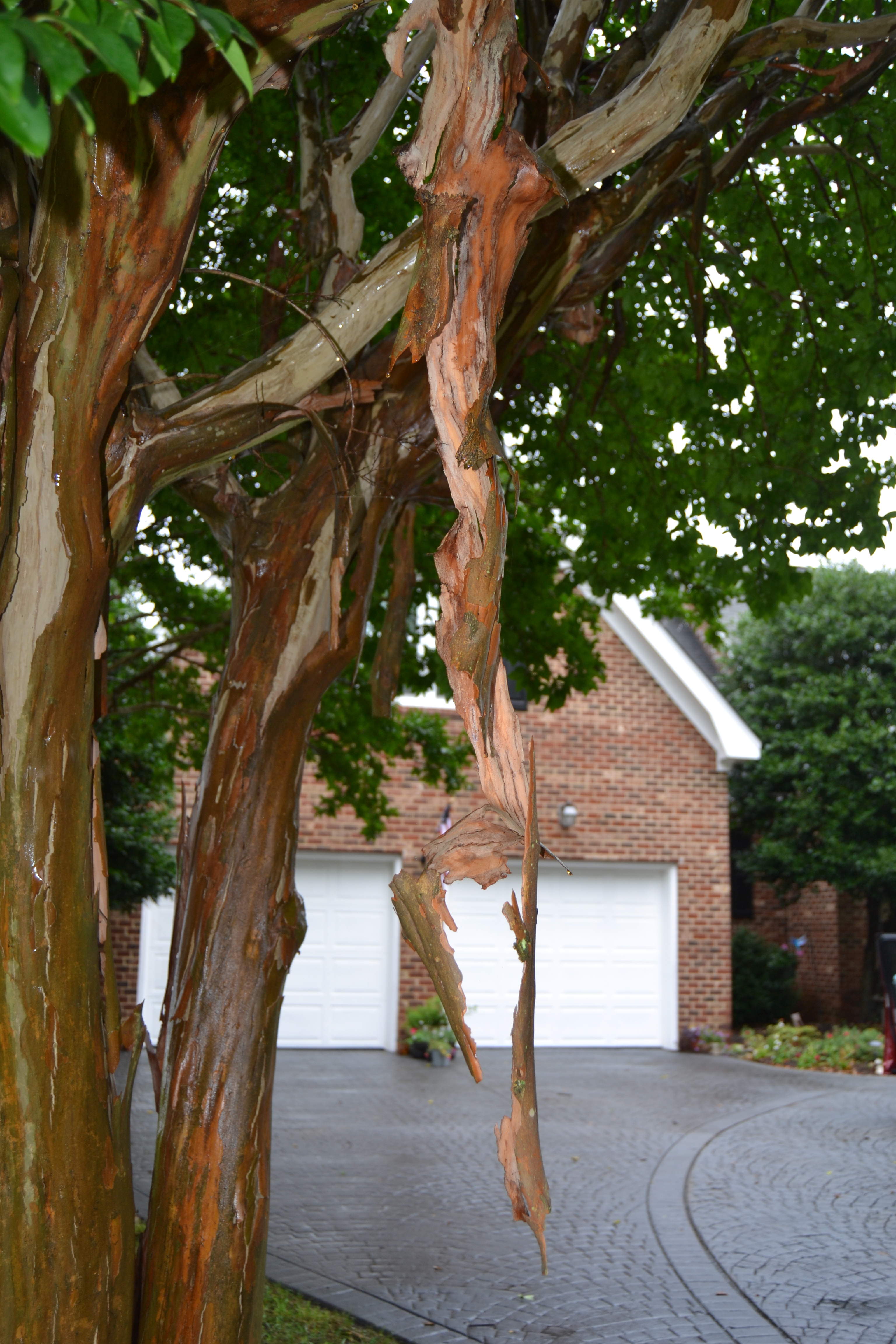 There were several crape myrtles in the yard of my childhood home. Although I’m sure it did, I don’t recall the bark shedding on those like the ones in our yard doing now. After a particularly hard rain last week, this was what I found when I returned home.