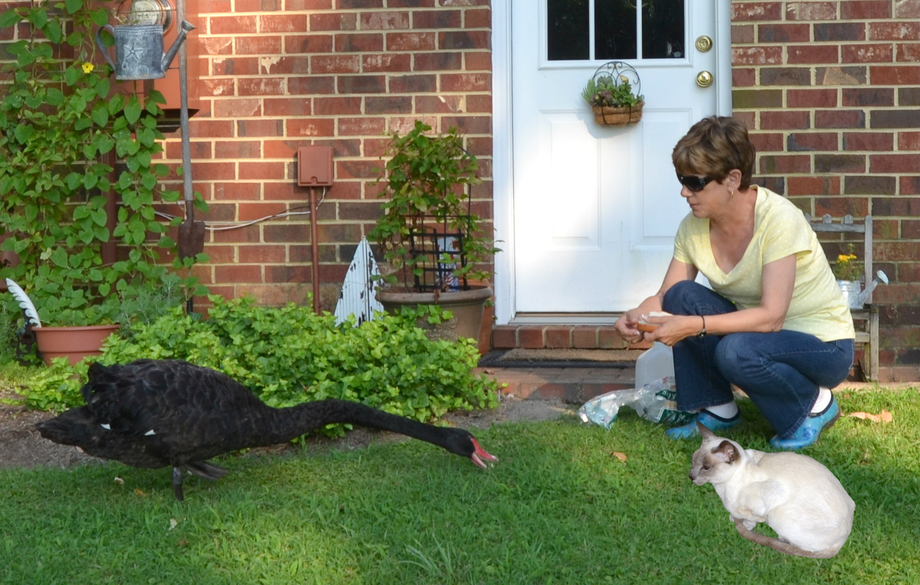 Nellie had seen pictures of Bride and Groom Swan here on the blog, and then she saw Groom Swan from the window! She wanted to meet him, and of course, he wanted to meet her!