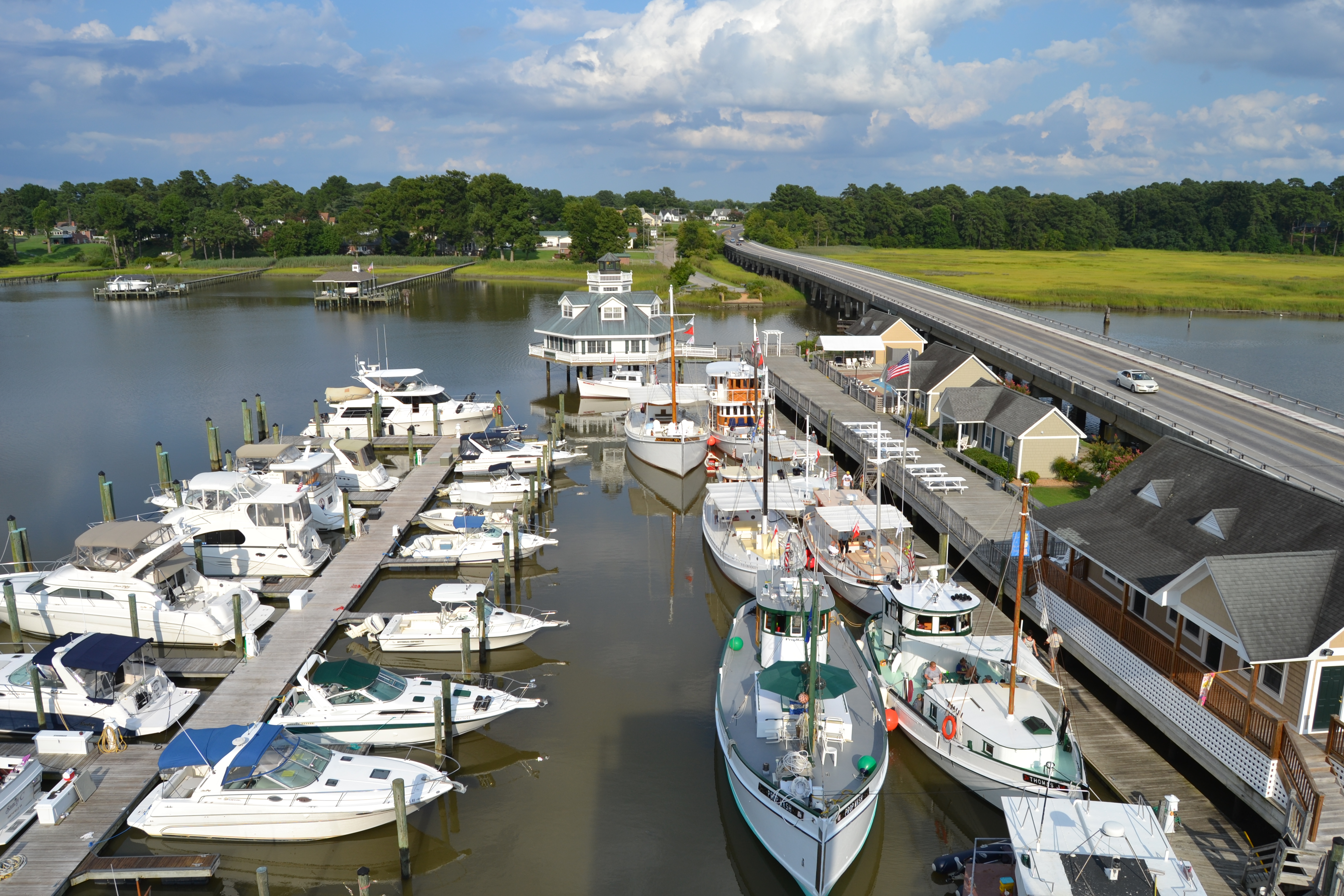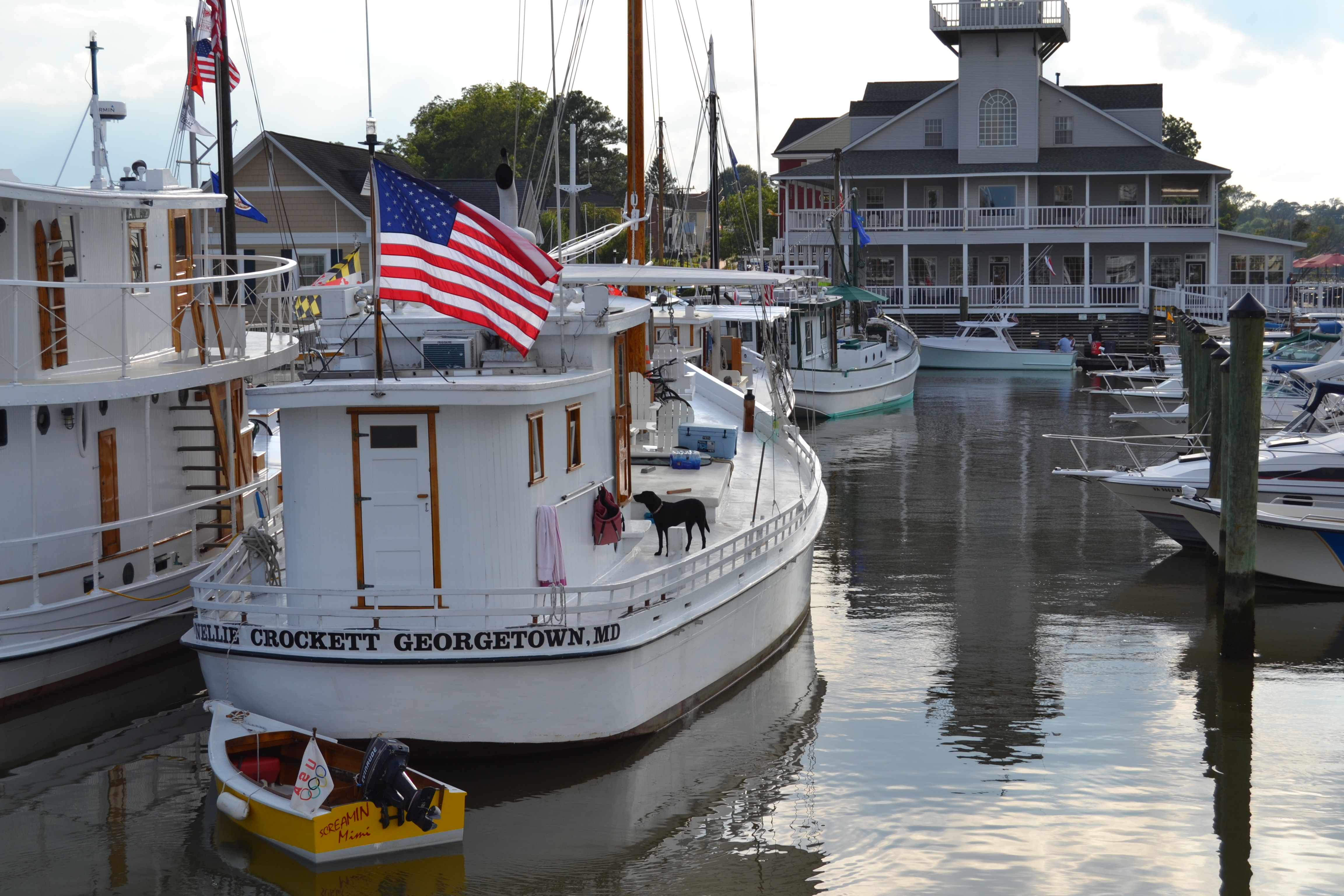 Last week, about a dozen buy boats visited the town of Smithfield as part of their yearly tour of ports in the Chesapeake Bay area. They stayed overnight at Smithfield Station Marina. The “Station” is also a restaurant and hotel, and the owners are friends of ours. They invited Motor Man and me up to the “Crow’s Nest” to have the best vantage point for photos.