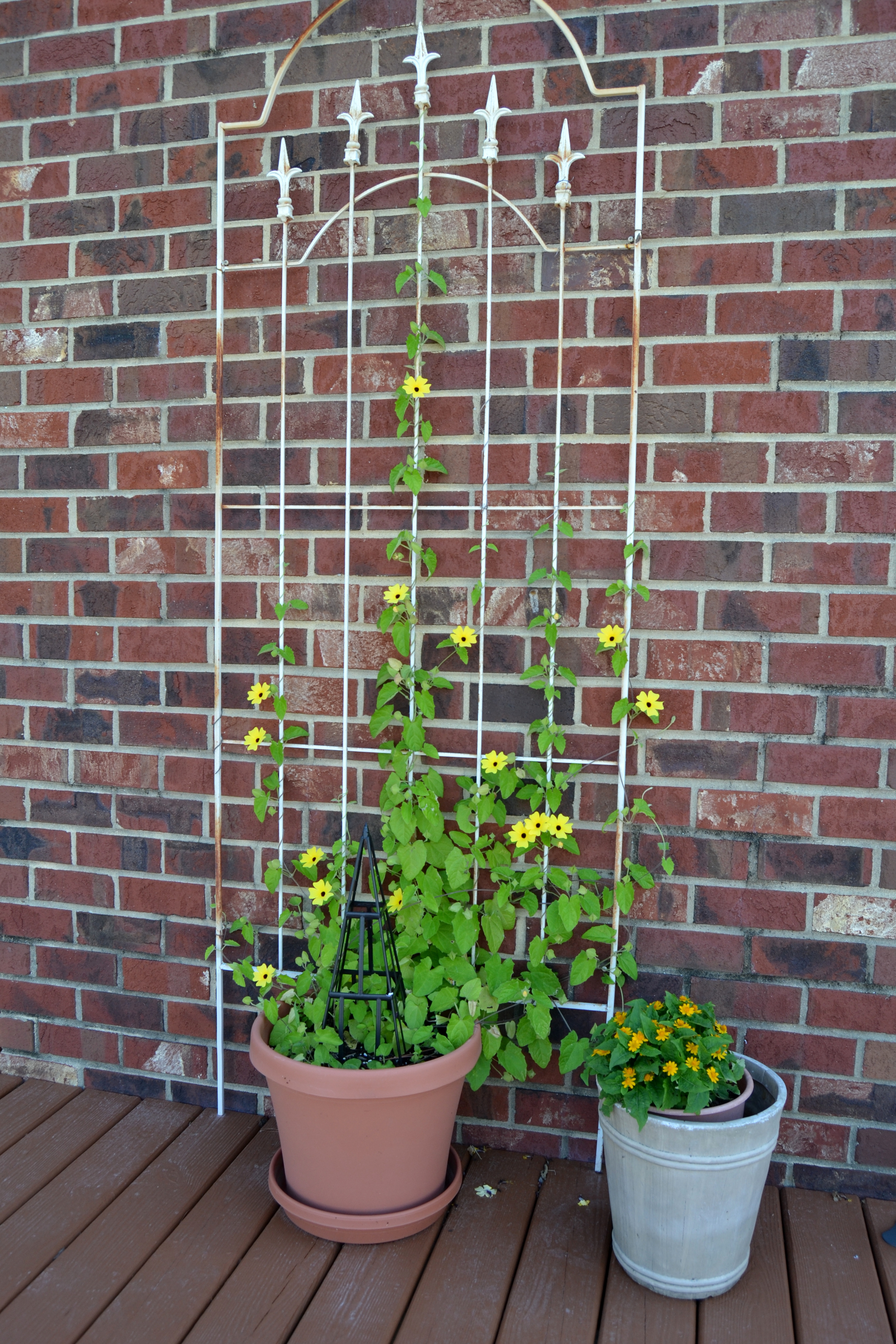 You may recall that one of my favorite  plants is Black-eyed Susan vine (thunbergia). After discovering it a few years ago, I look for it every spring. This year, I bought several to plant in different areas of our yard. One of my favorite places to plant it is on our deck, where the plant can grow up this old-looking weathered white trellis. This photo was taken on May 19.