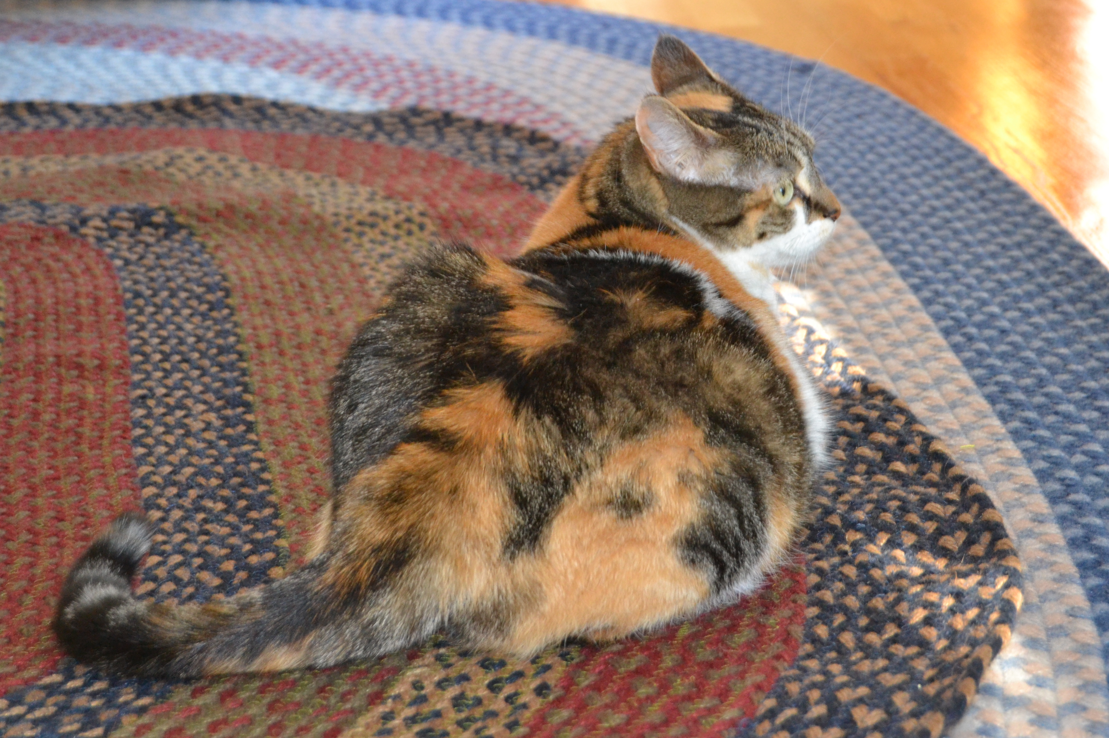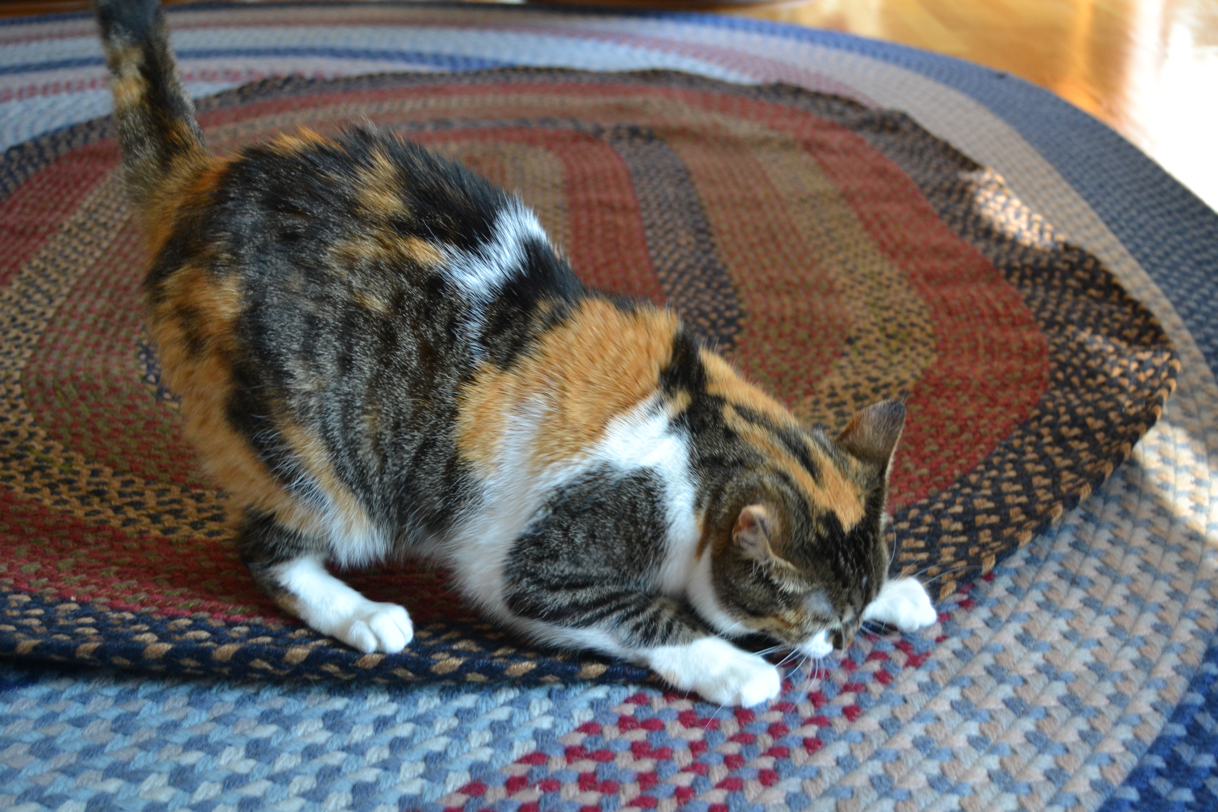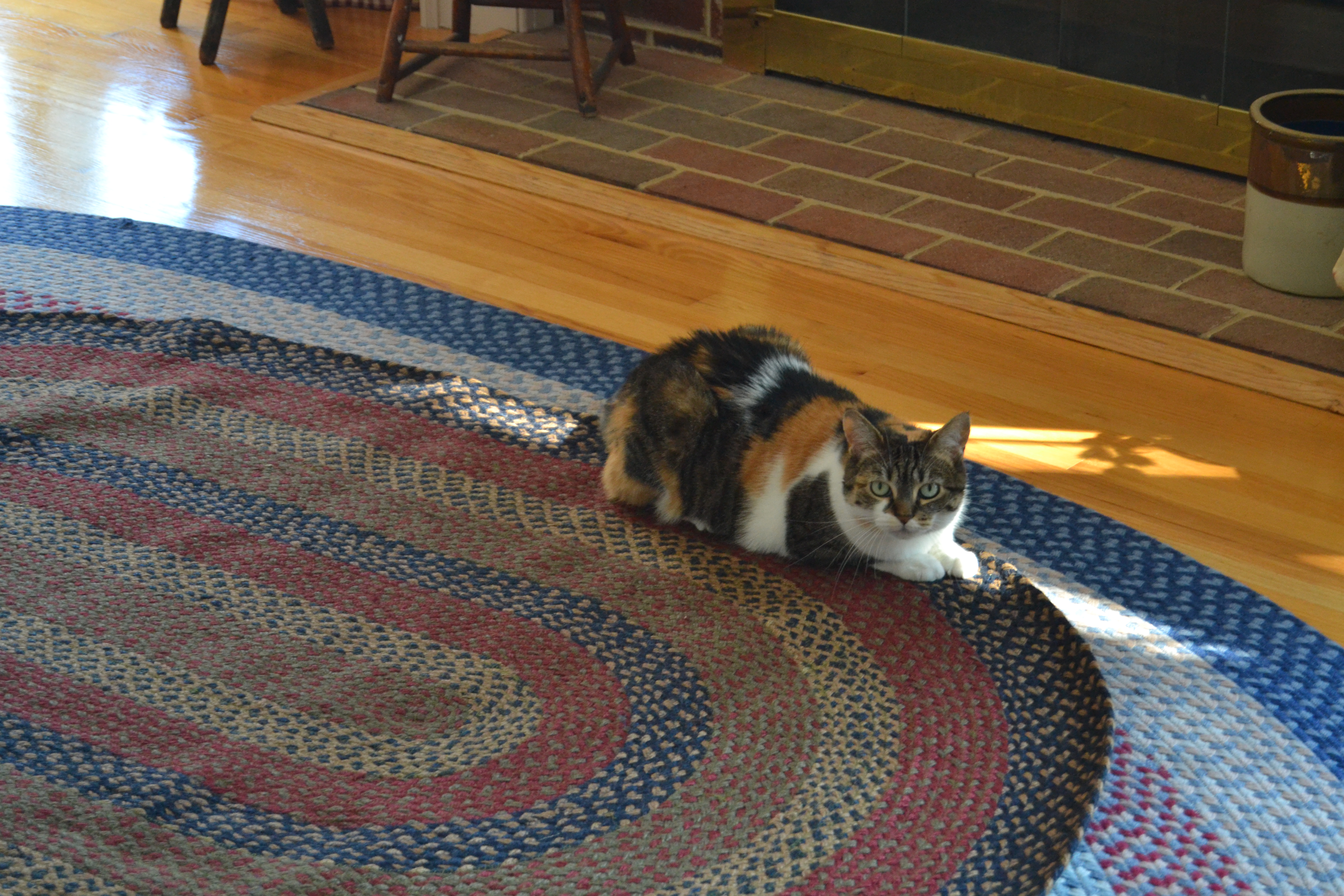 Recently my pawrents brought home a new braided rug for the dining area of the kitchen. Since it had been rolled up, Motor Mommy laid it out on the floor in the living room, so it would flatten out.