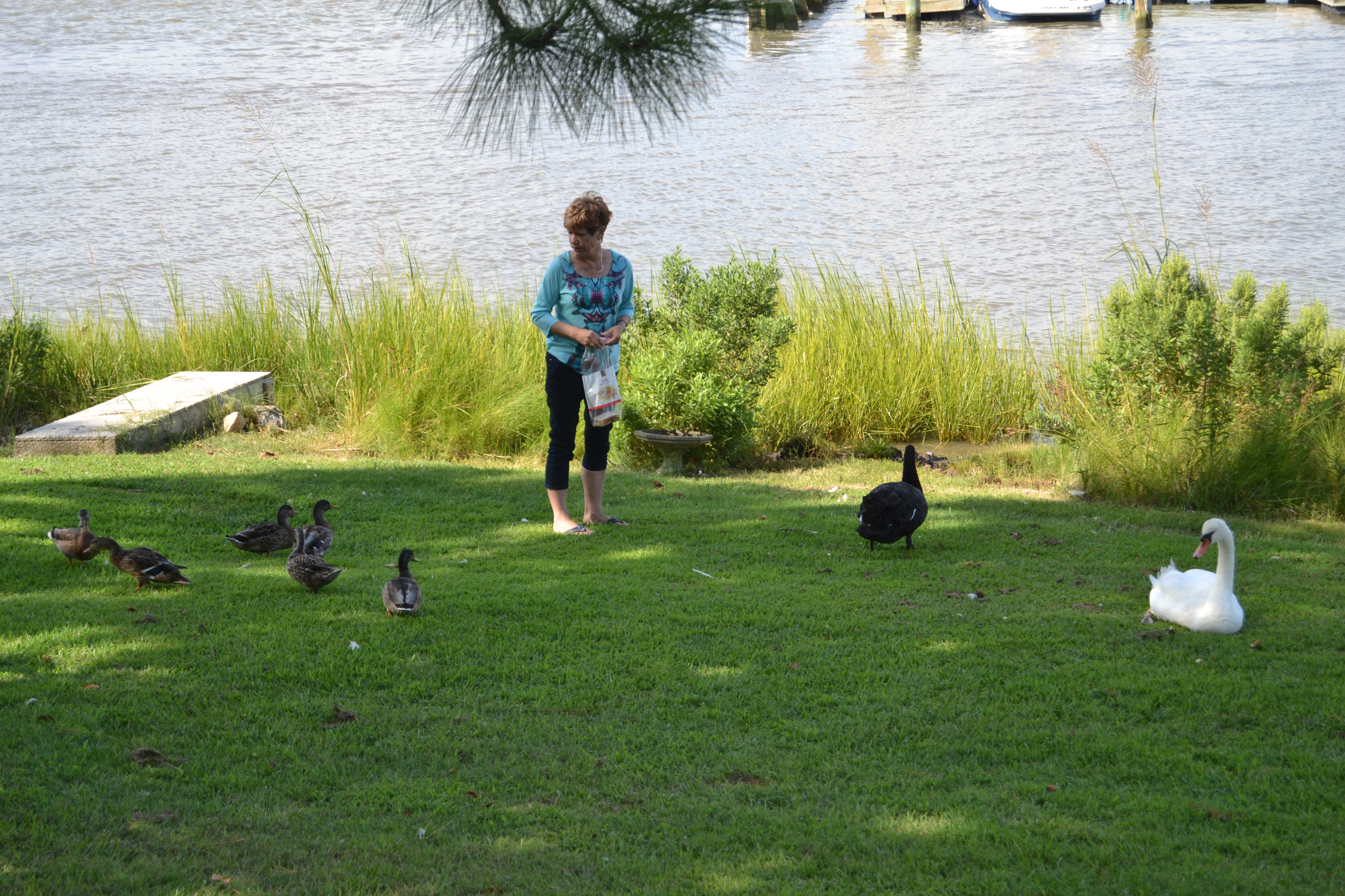 Saturday afternoon, I glanced out and saw Bride Swan. By the time I reached her (with bread), the ducks were all there, too. Then Groom Swan came swimming in and joined the others on land.