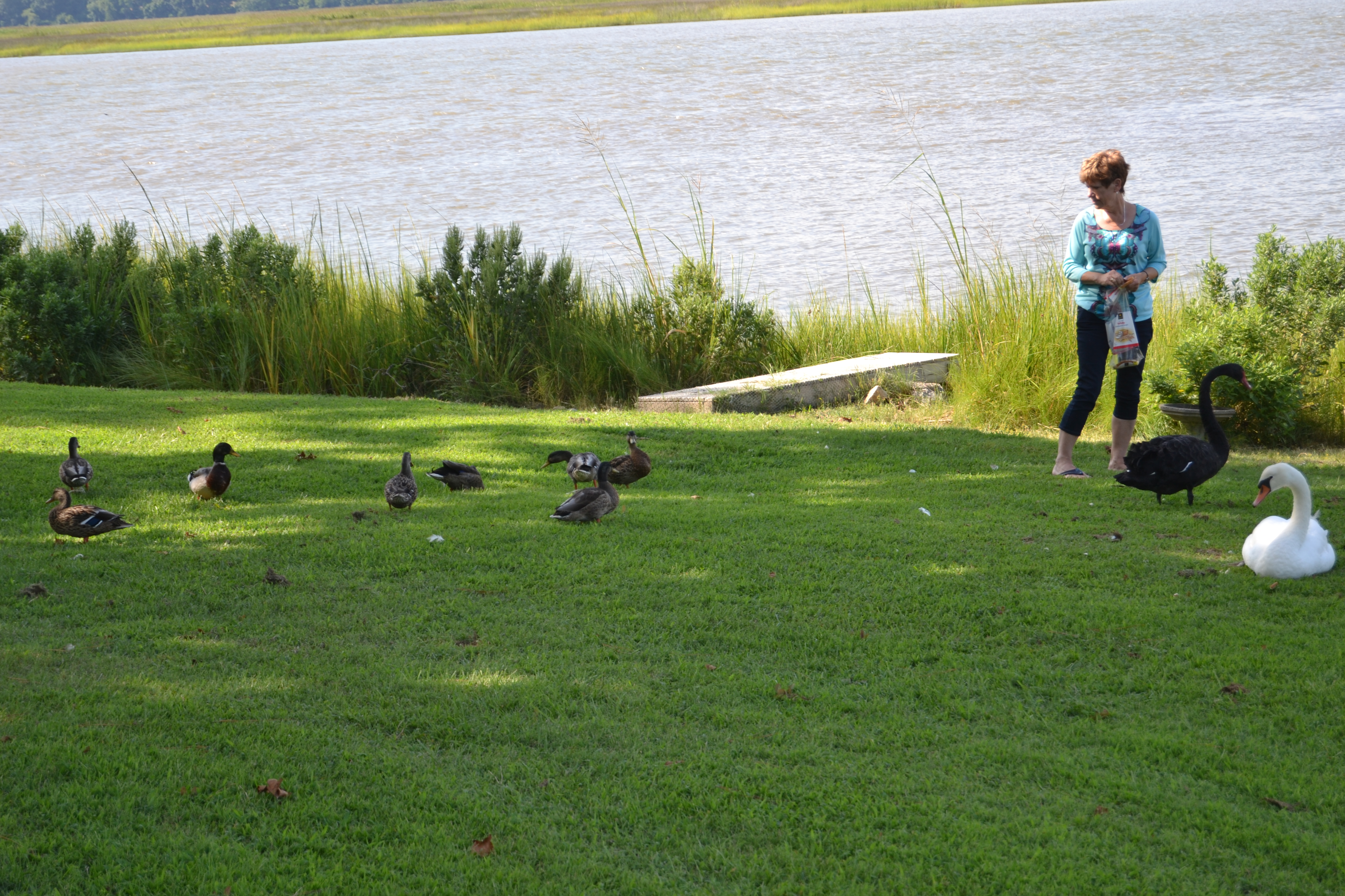 Last year, Motor Man built a little walkway for me to stand on to feed the swans and ducks – when they’re actually IN the water. (We aren’t allowed to have a dock, so this just “sits” on top of a large drainage pipe.)