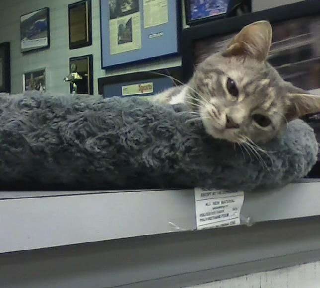 Anyway, when I’m not working or entertaining our friends and customers, I relax in my little kitty bed. It’s on the counter just inside the office door. (Motor Man had to tape it down; I thought it was a fun game to knock it off the counter.)