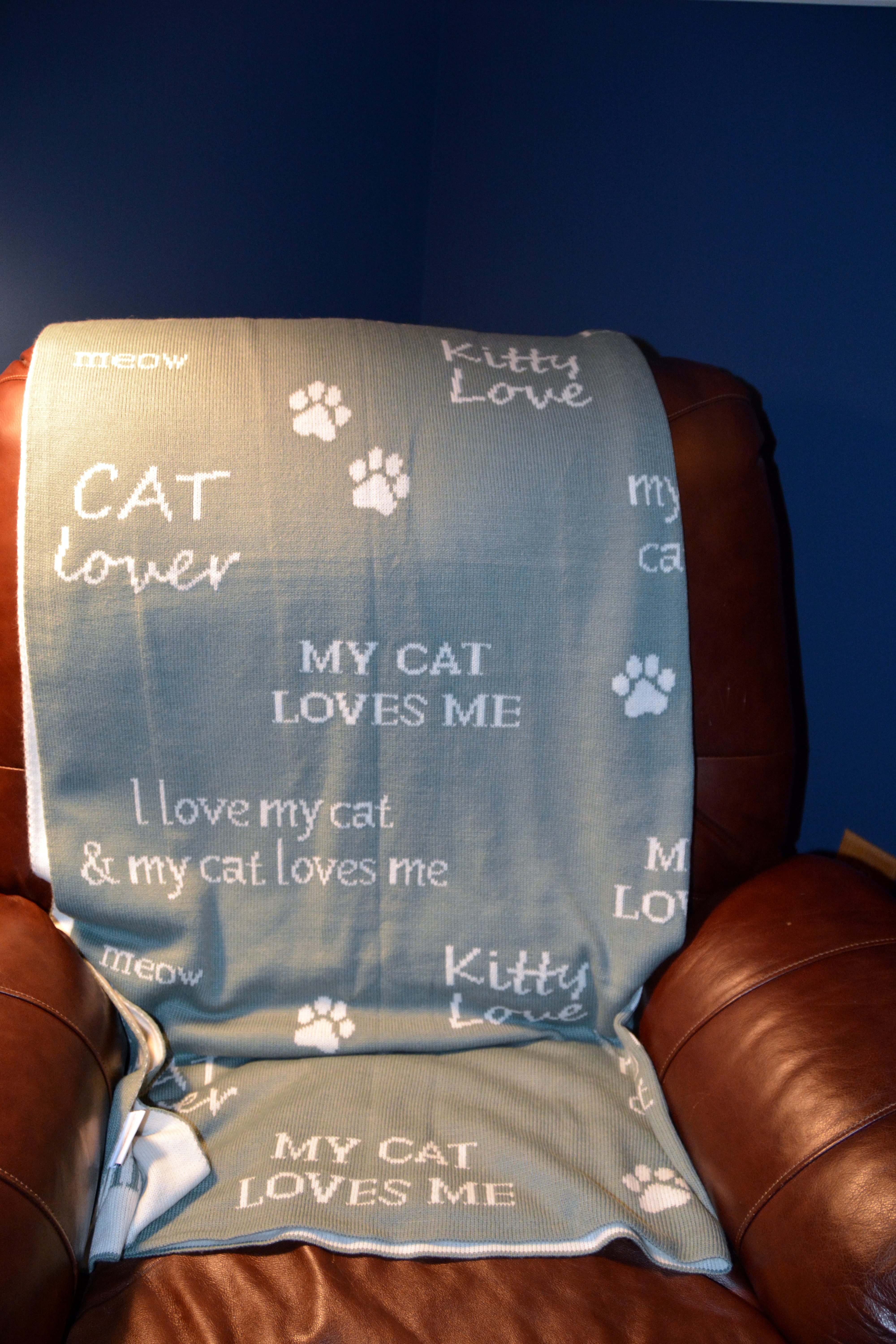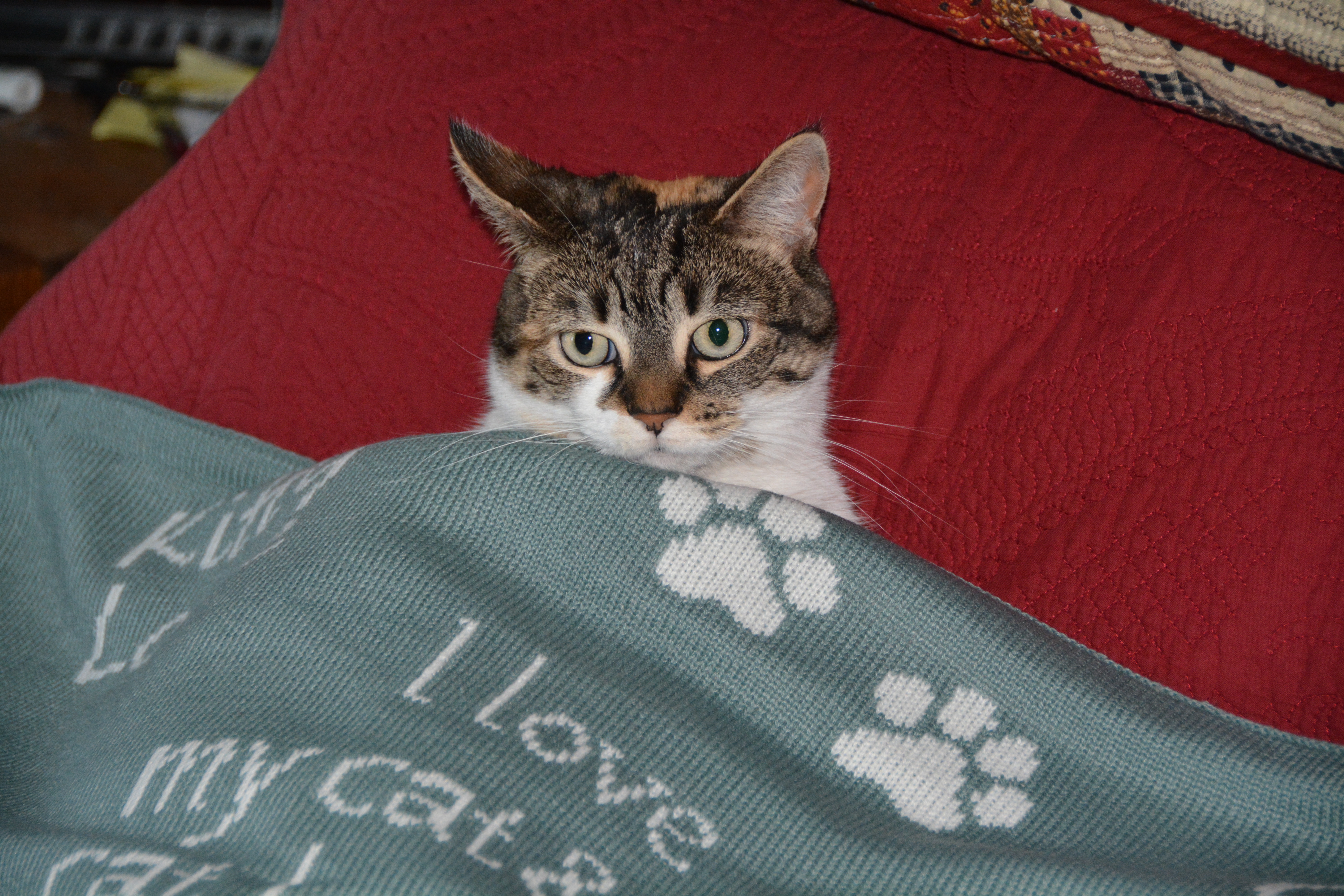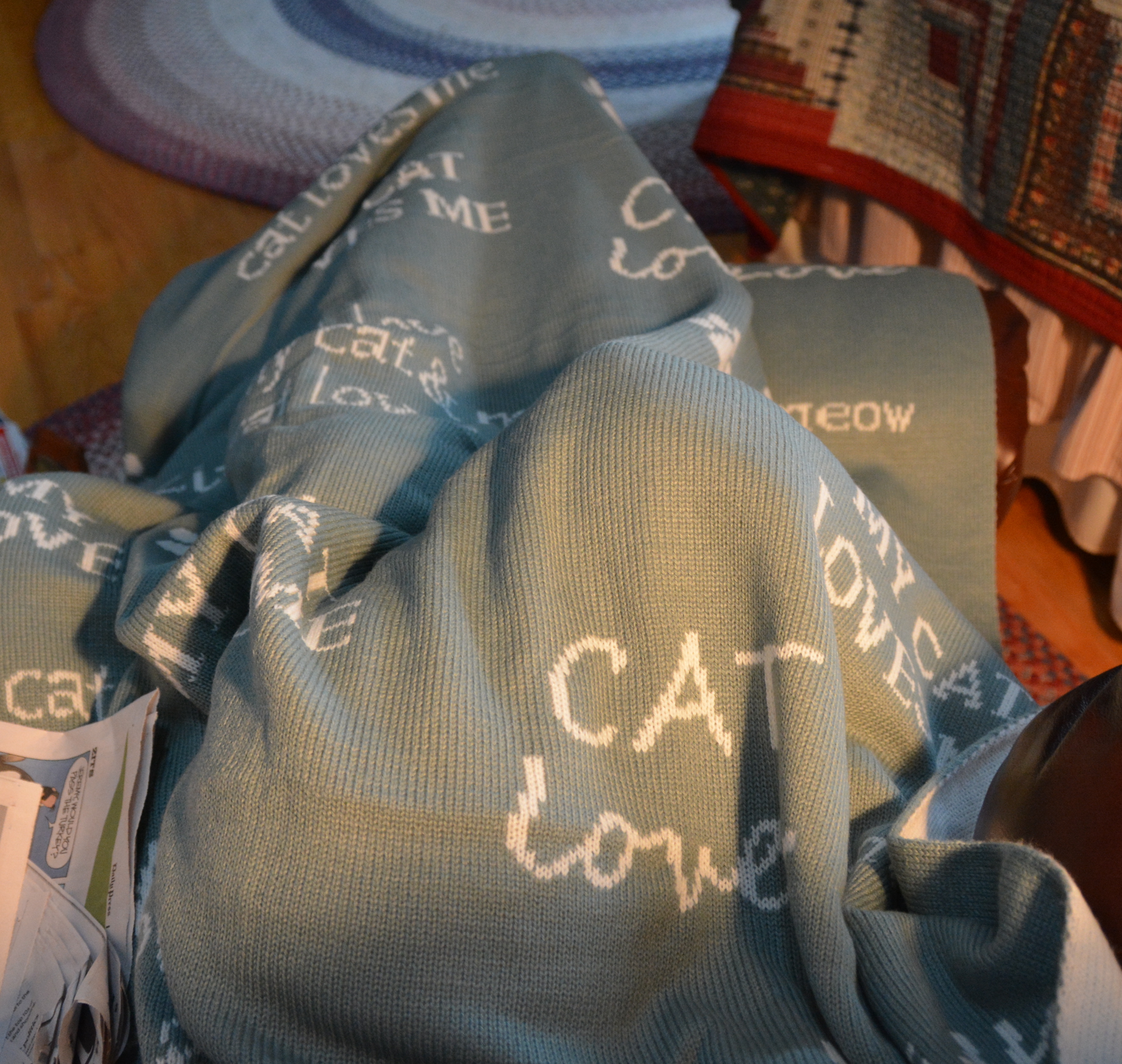 But in the past couple of months, she has become a lap kitty in the evenings, when I finally make it to the recliner. So, for Christmas, Sundae gifted me with this kitty lap-nap throw.