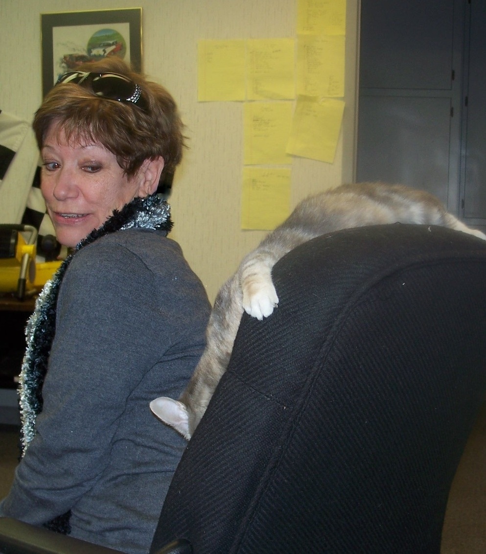 And my favorite photo of the week was taken yesterday. Gypsy had been perched up on the back of my chair. Motor Man was laughing at how she was just holding on and riding as I rolled around. Right as he took the picture, Gypsy suddently rappeled down the back of the chair. All I could hear were her claws on the fabric of the chair.