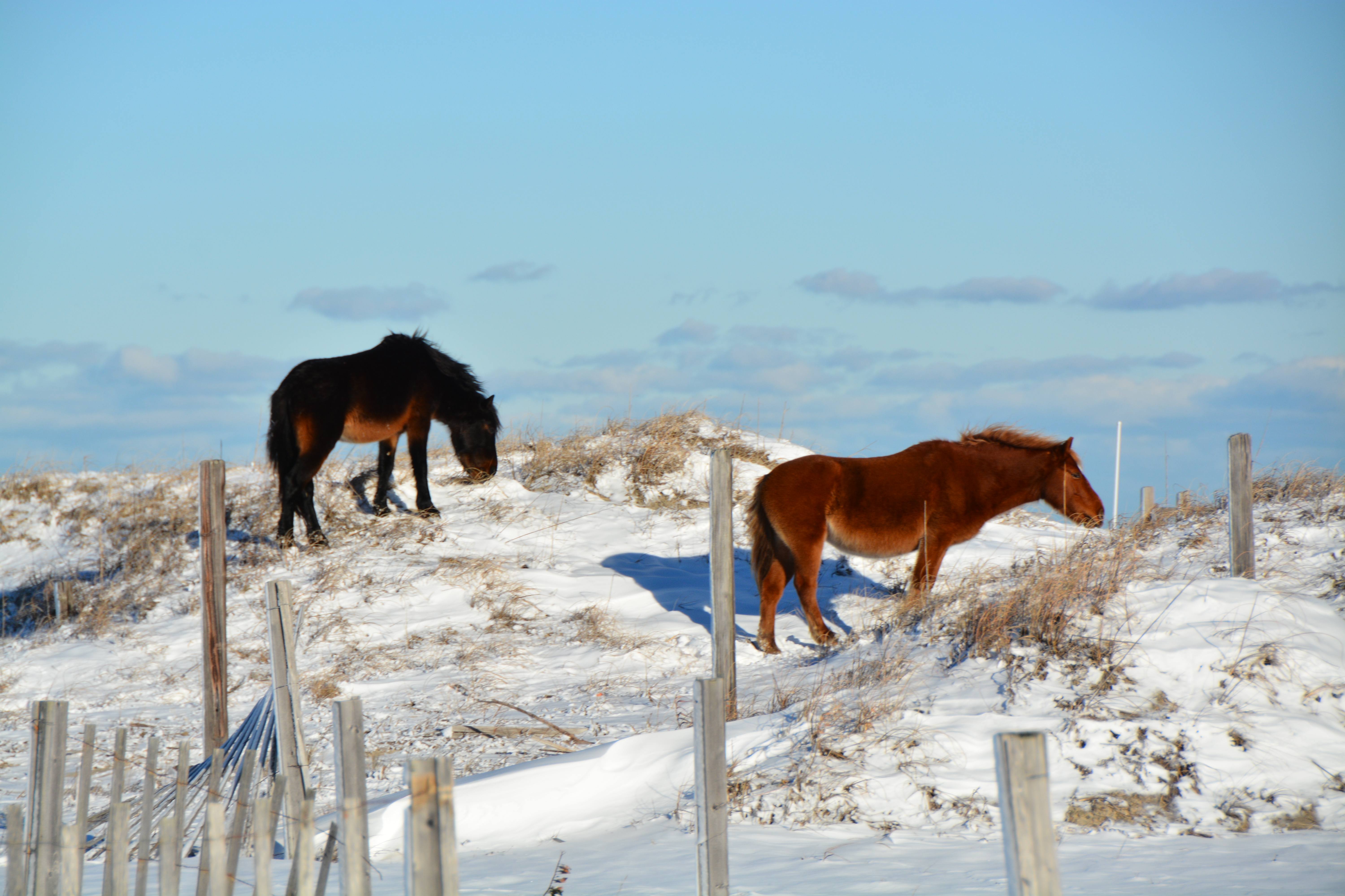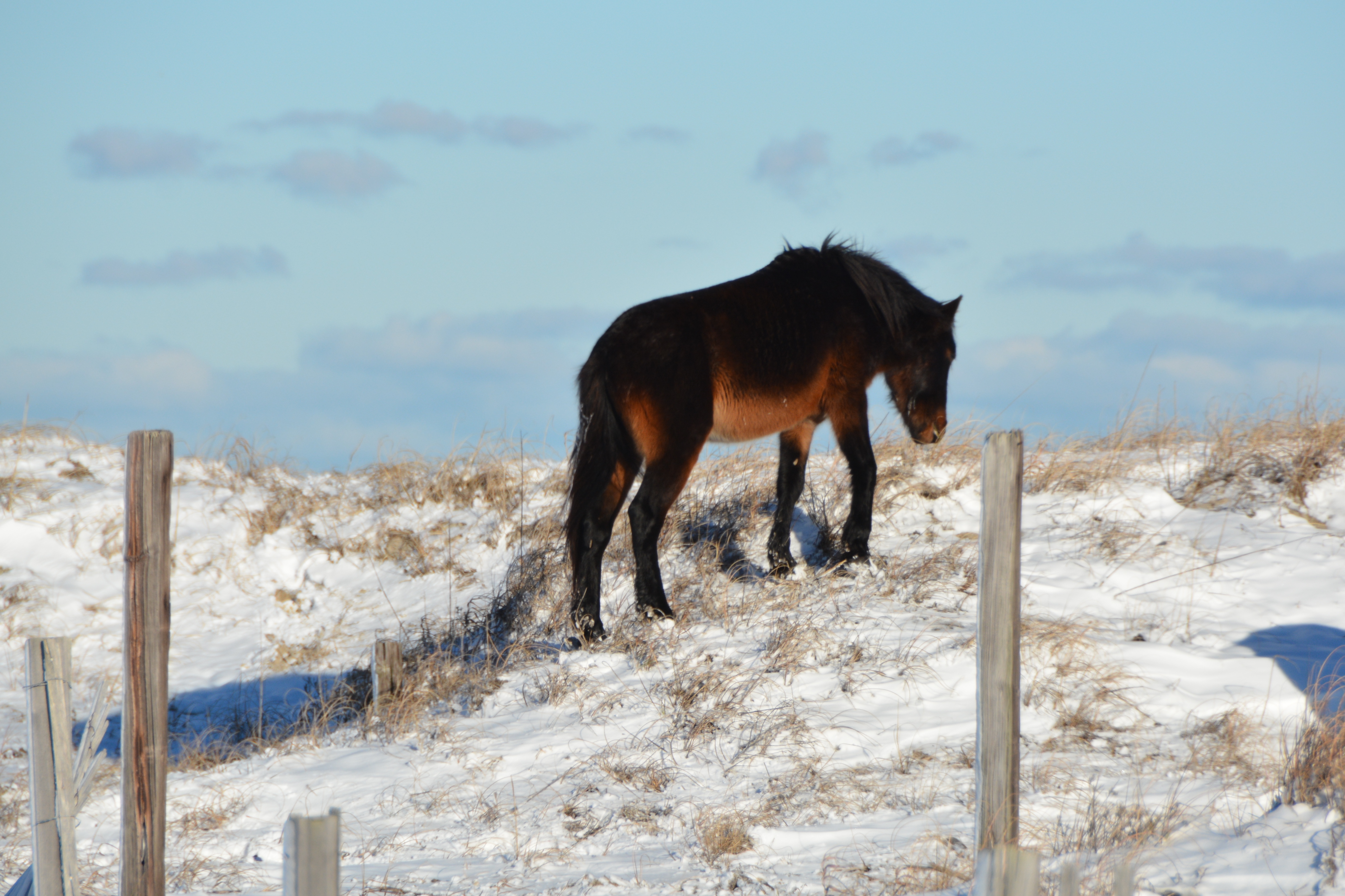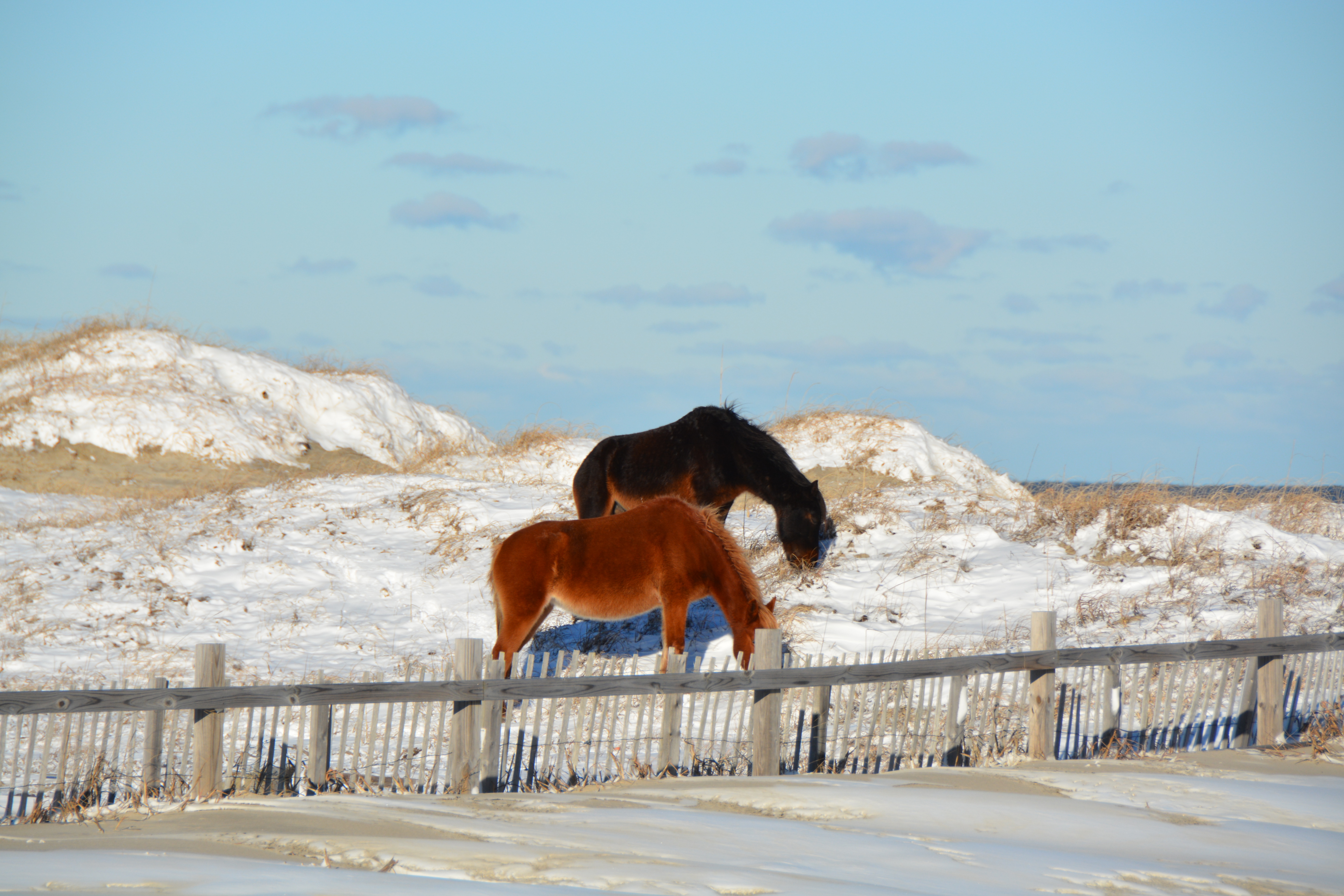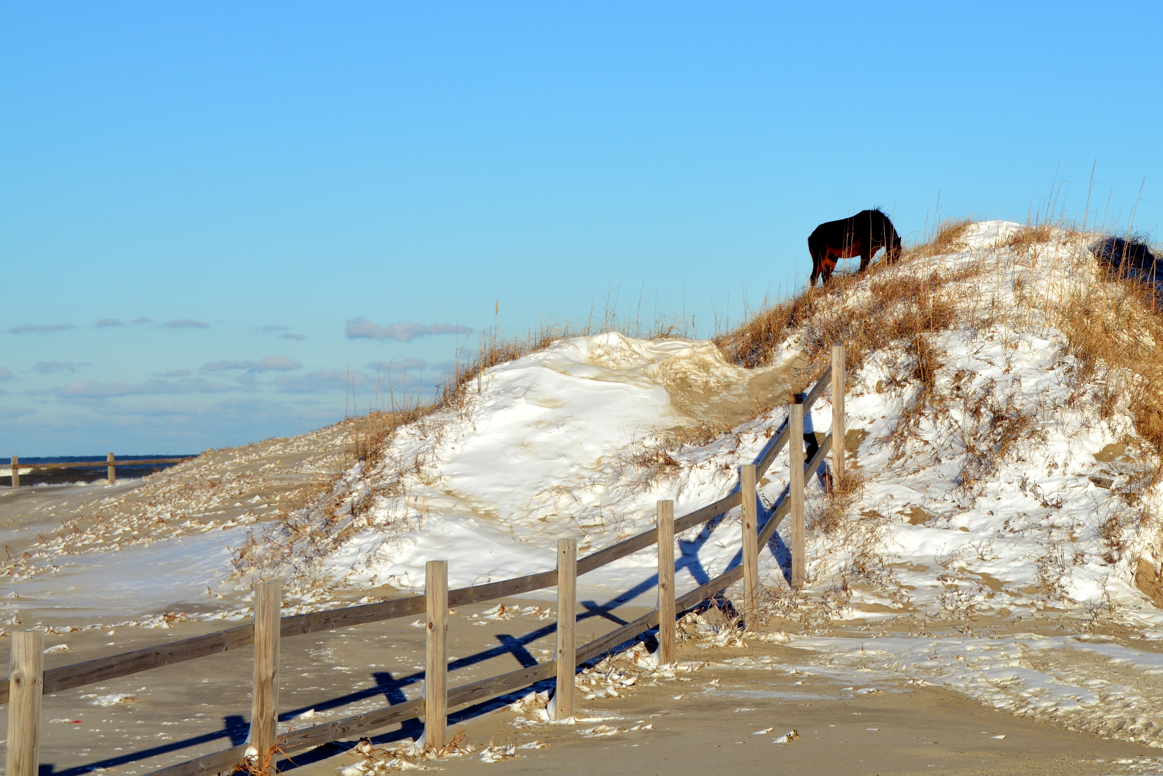 As you can see, the Outer Banks had a dusting of snow beginning Tuesday afternoon. The following video was posted on the Corolla Wild Horse Fund Facebook page yesterday. It’s a good thing the horses are wearing their thick winter coats.