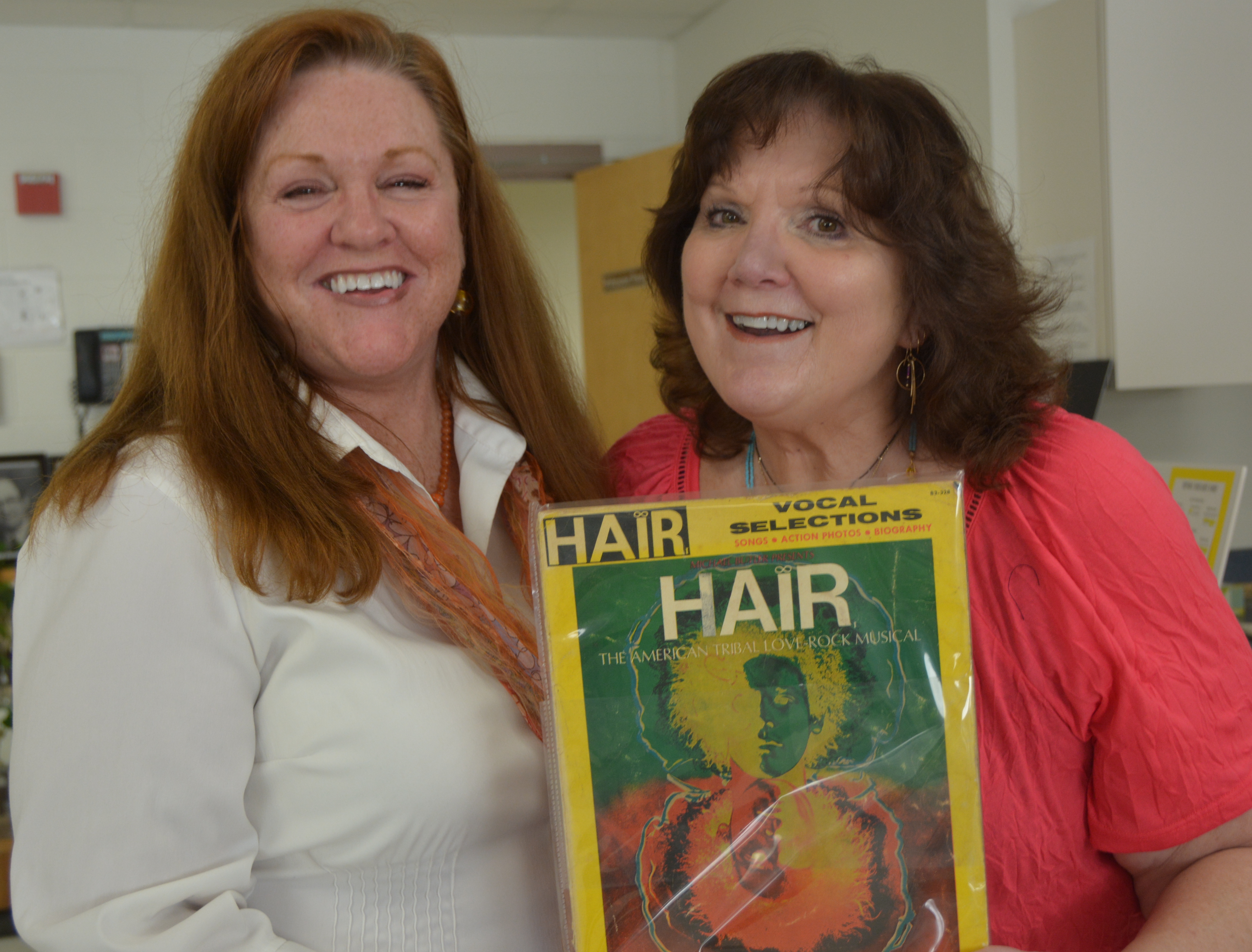 At one point while we were at the exhibit, I heard shrieks coming from the other side of the room: Shirley and Donna had found the souvenirs from the Broadway play, Hair. Our senior class trip was to New York, and some members of the class, after getting signed permission slips from their parents, went to see Hair. (I was in the group that saw Promises, Promises instead, but Shirley and Donna agreed to let me in on this picture.)