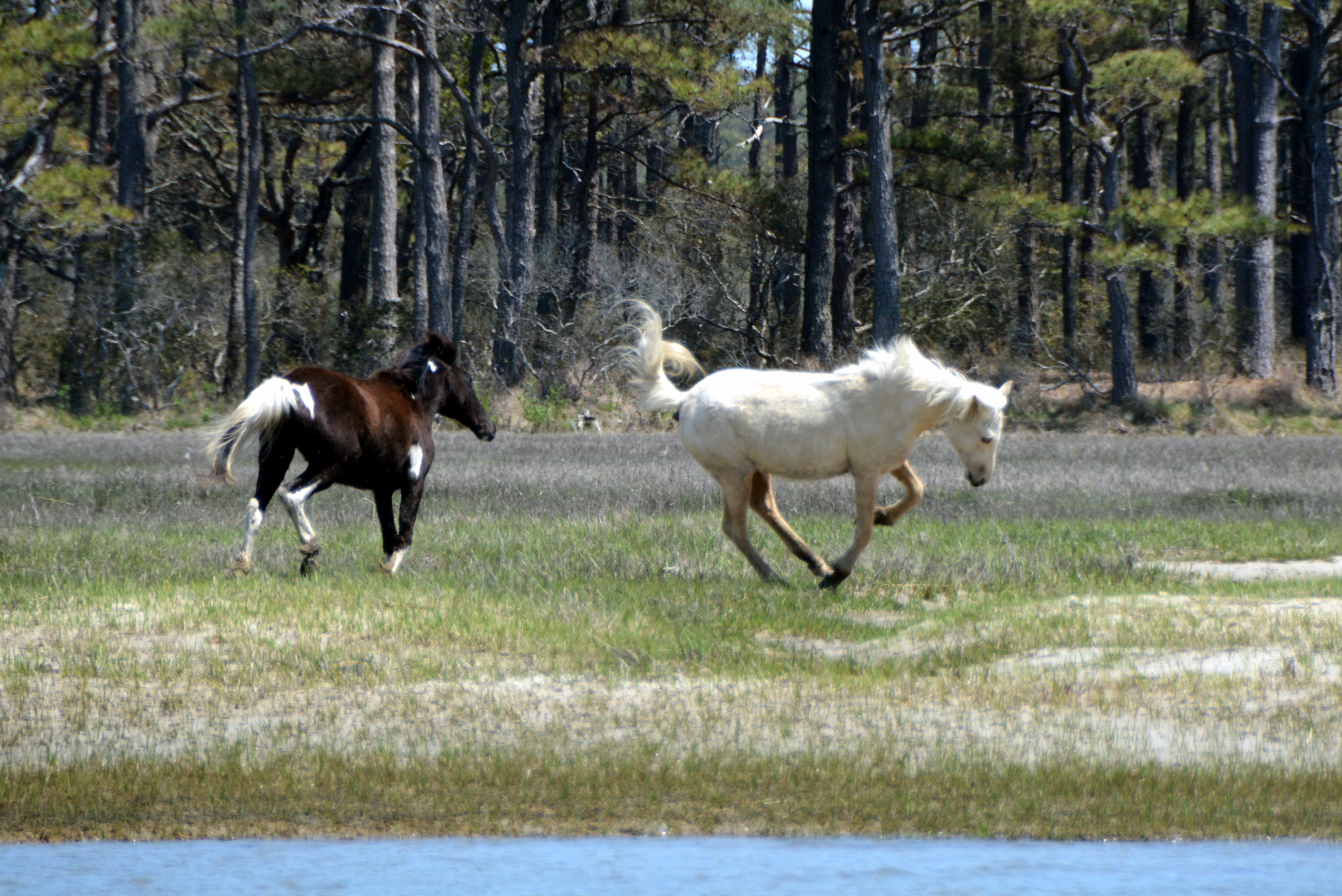 Just a little information: there are approximately 150 ponies (they’re too short to be called horses) living on Assateague Island. They’re owned by the Chincoteague Fire Department, and in July of each year (since 1925), they’re rounded up by the fireman (called Saltwater Cowboys). The ponies swim the short distance from Assateague Island to Chincoteague Island, where all the foals born that year are auctioned. A few are pre-selected to be returned back to the Island. Those are called “buybacks”, and the highest bidders of the buyback ponies are given certificates of ownership, and allowed to name their ponies, which will then live out their lives on Assateague Island.