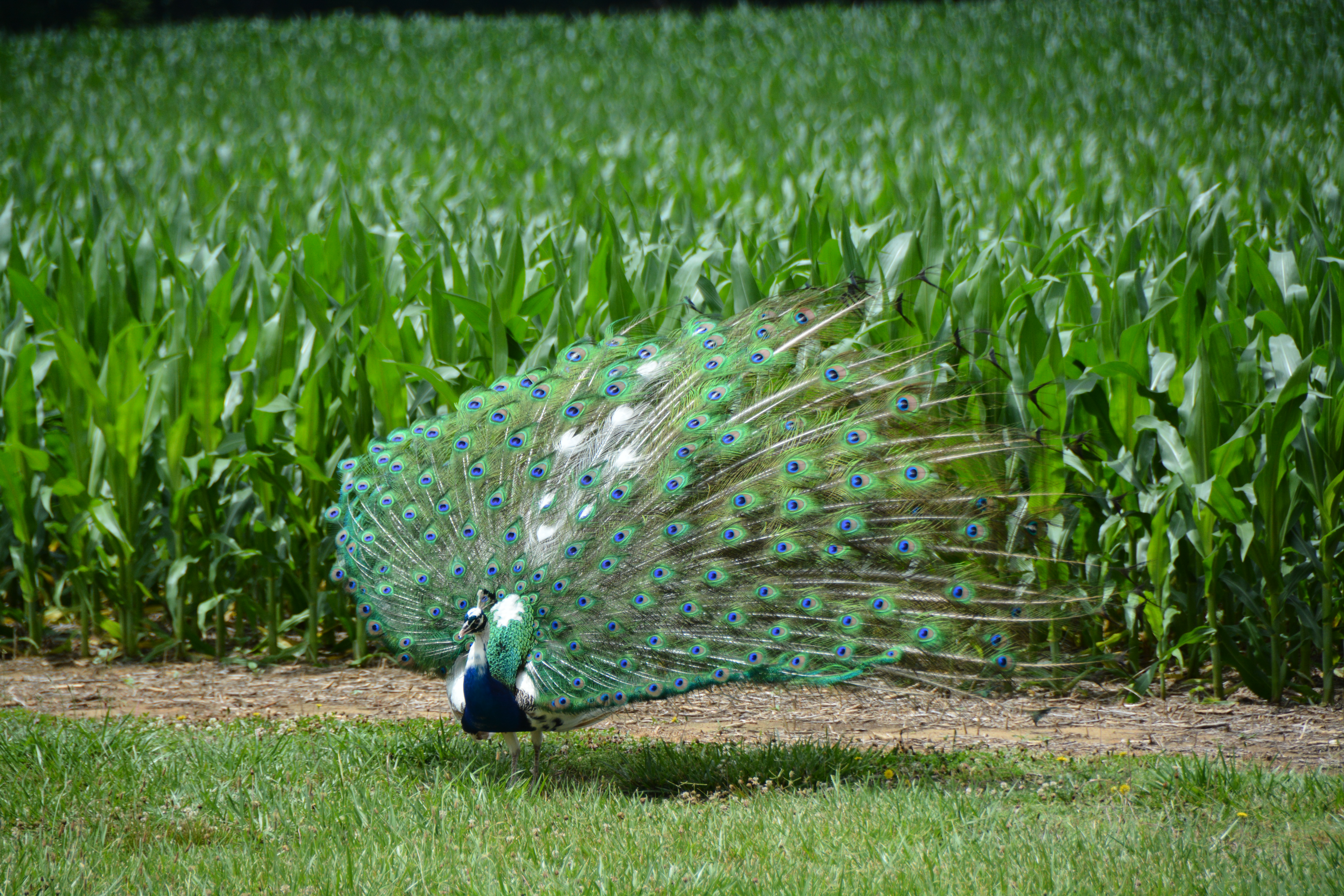 1.) I visited my friend, Shirley, recently. She lives in her family’s old homeplace, and has two peacocks, both named George. I’d visited before, attempting to get good pictures of George, but he didn’t cooperate. Last week, he favored me with a pose. That beautiful green corn growing in the background reminded me of the summer days of my childhood.