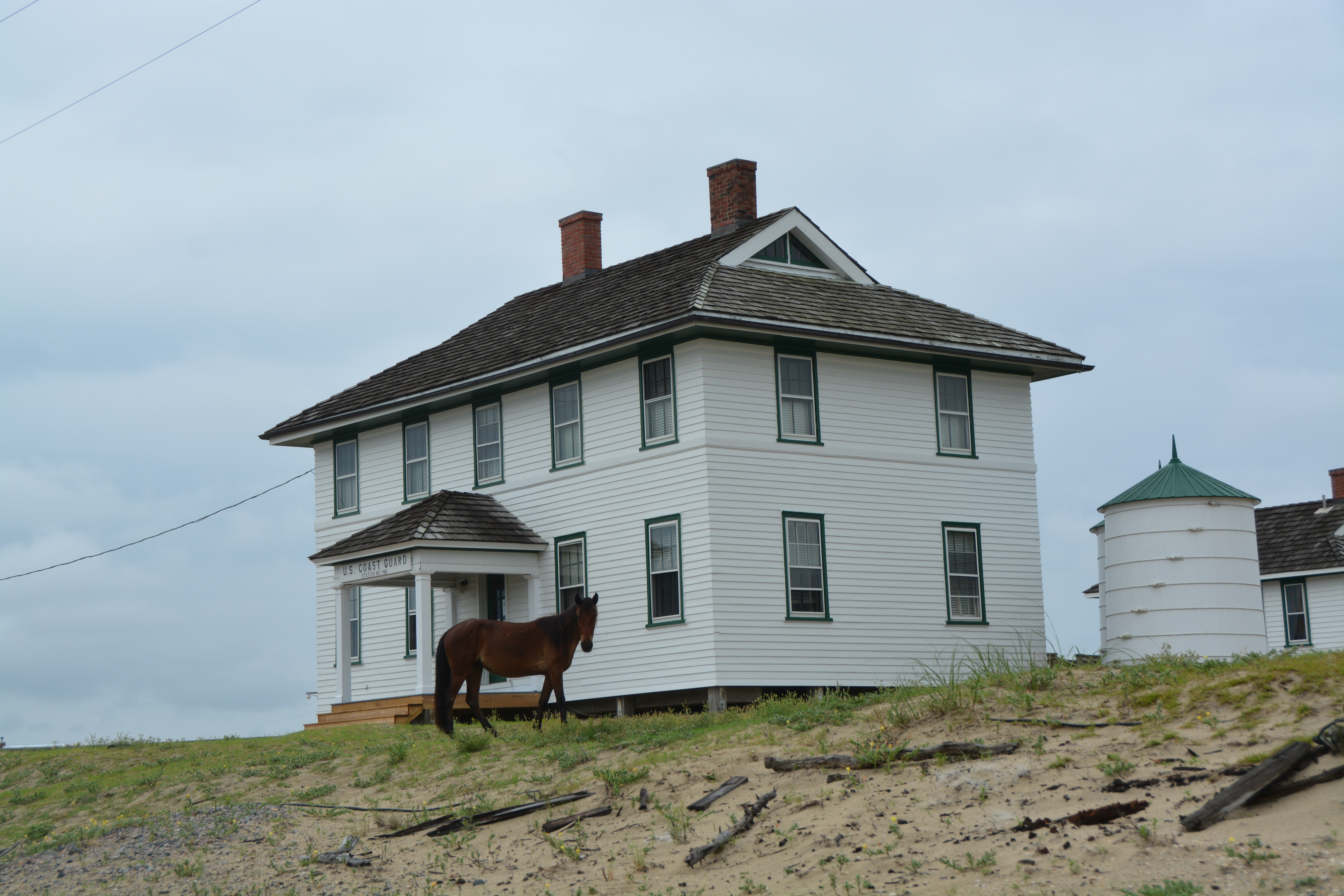 Why, yes, as a matter of fact, we saw a total of 39 horses.  The first one was standing in front of the restored Coast Guard Station. This picture was taken from the beach.