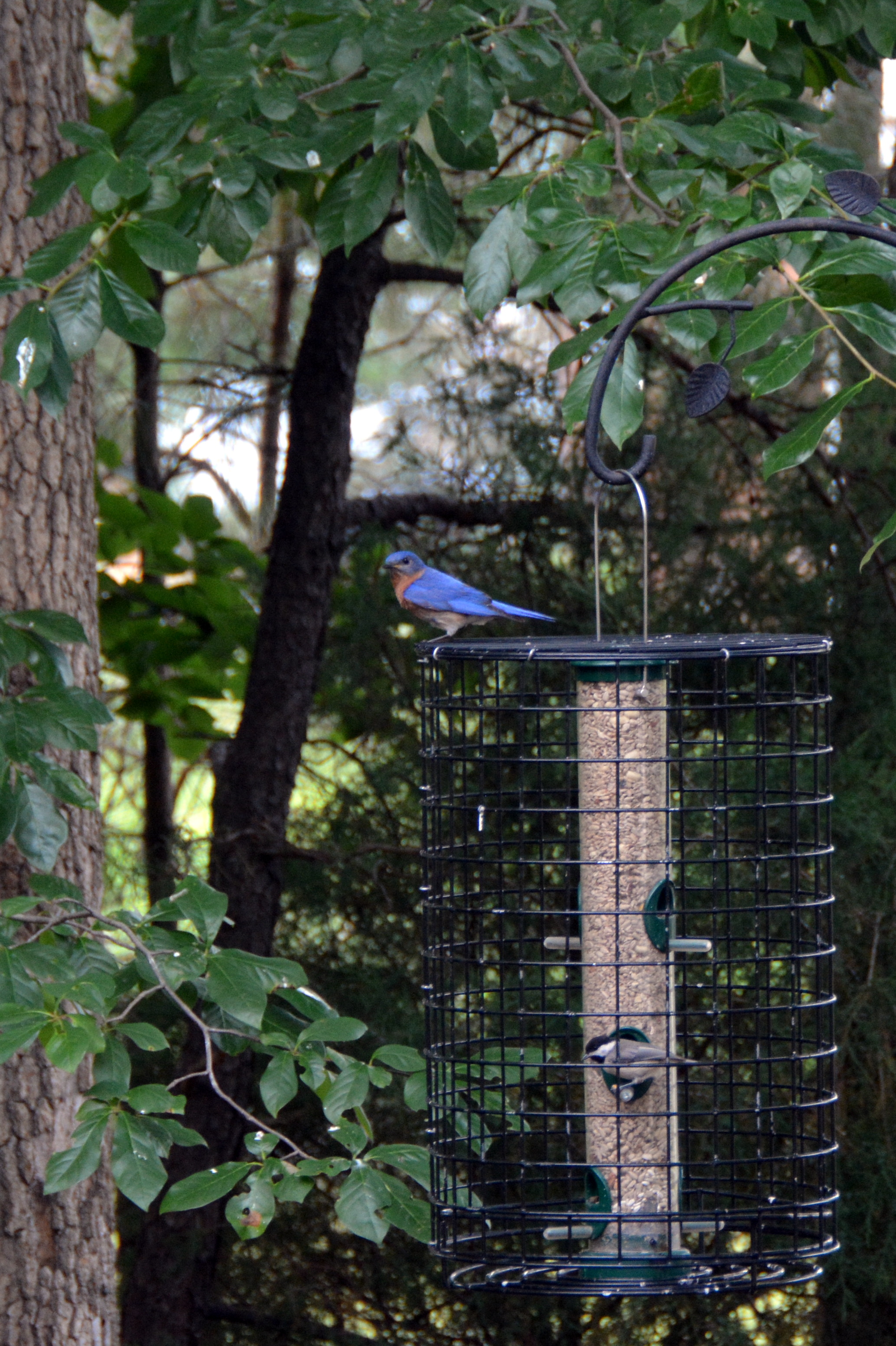 While an employee attempted to “shoo” away the invasive blue jays and house sparrows, blue birds came to feed just a few feet from us. (This photo was taken with a zoom lens (they weren’t quite this close.)