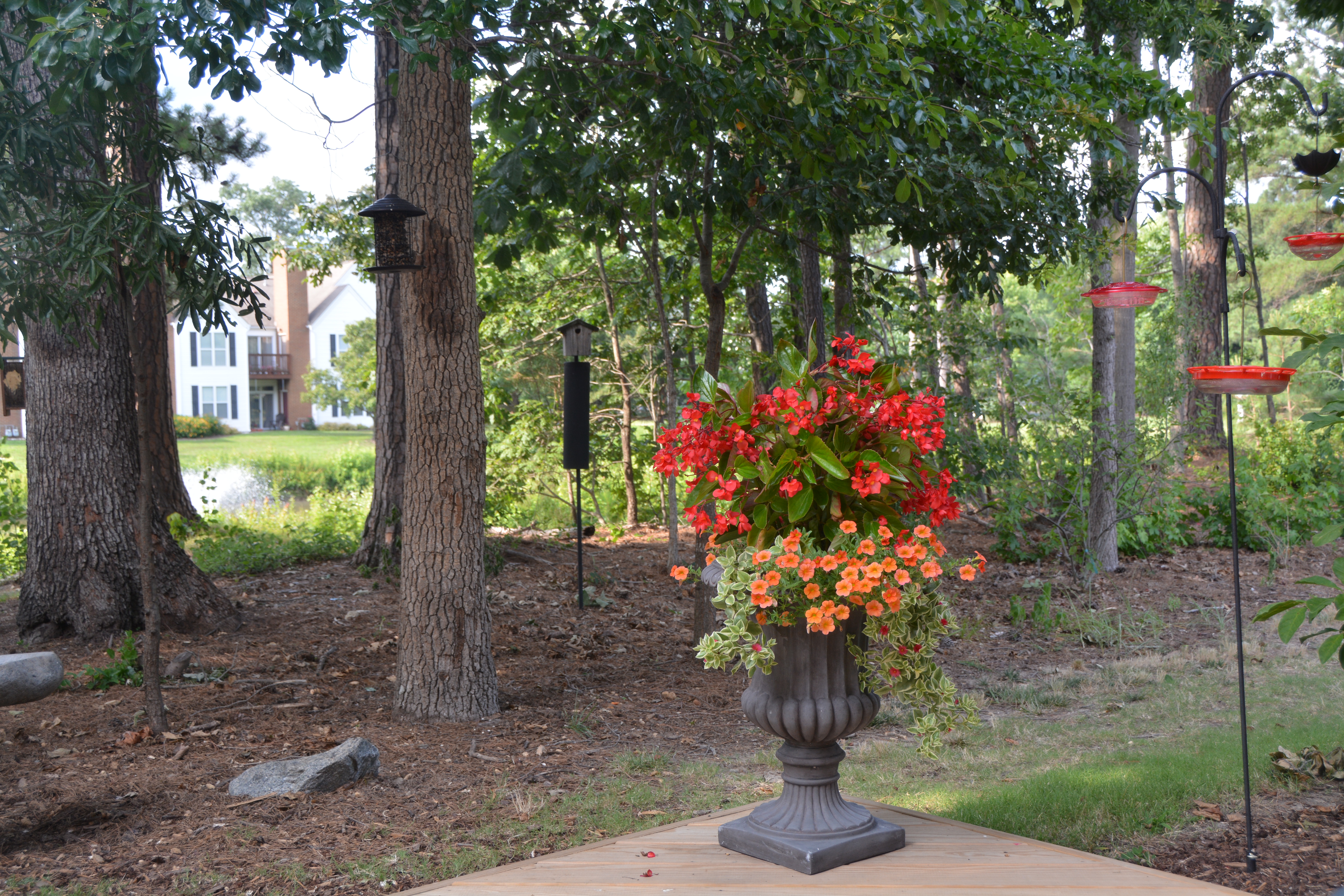 The shop is located in a commercial area, but there’s a residential development directly behind it. There are flowers in colors meant to attract birds, especially hummingbirds.