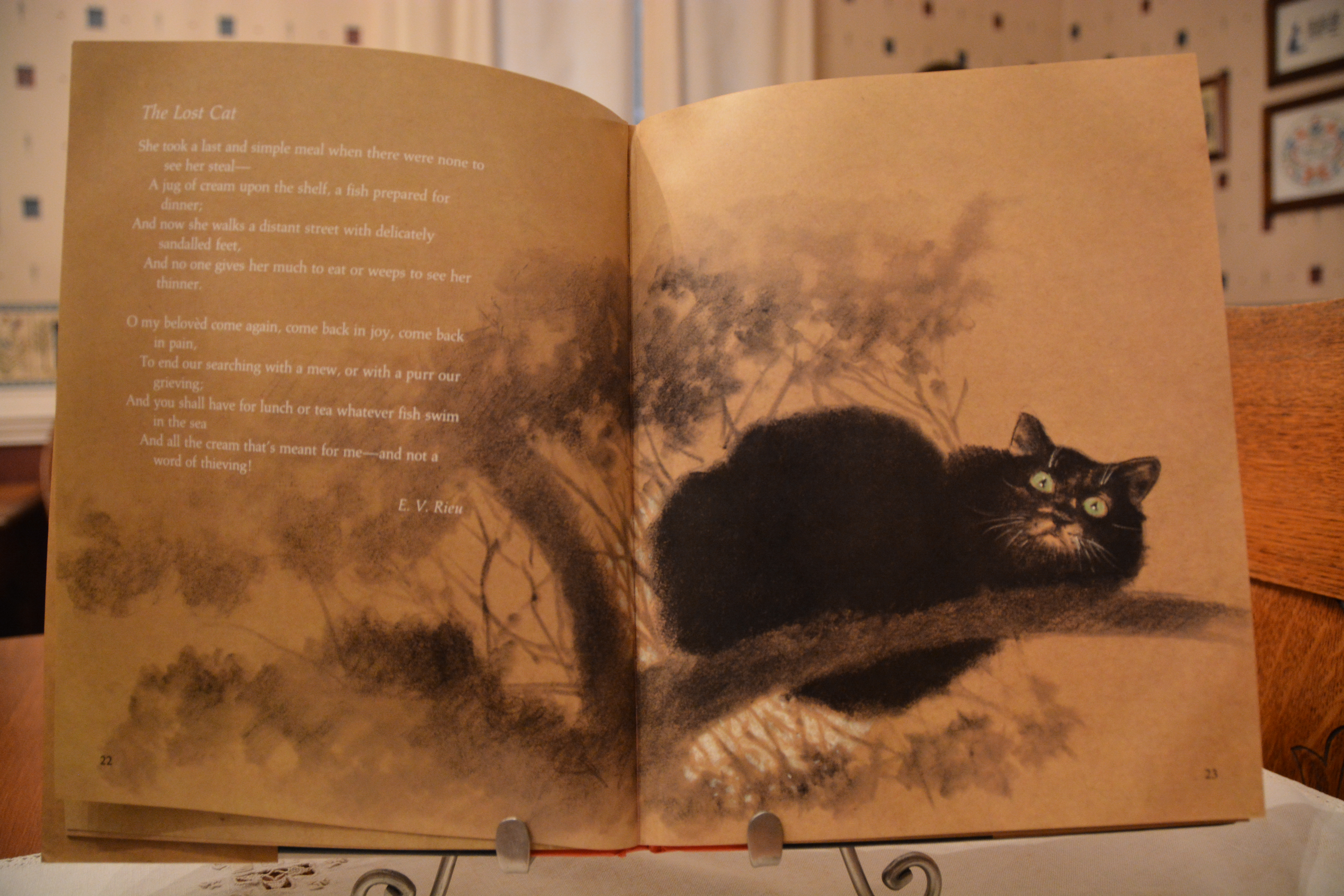 It seems there’s almost always been a cat in my life through the years. During my childhood, most of them were strictly outdoor kitties. The poem with this next illustration brought back sad memories of all the cats in my past who simply disappeared. For days months, I longed for each kitty to return, until finally I realized that it was gone forever.