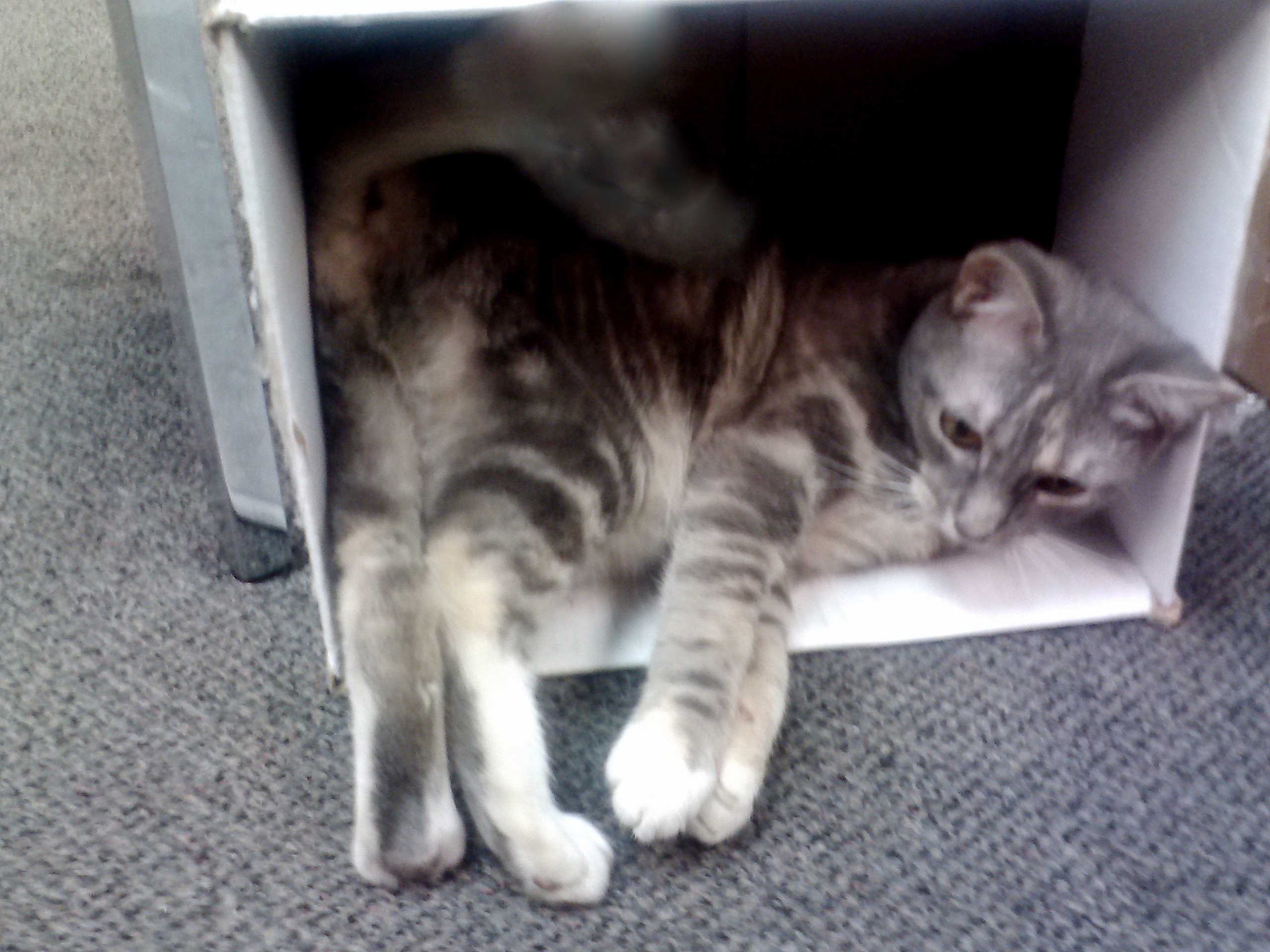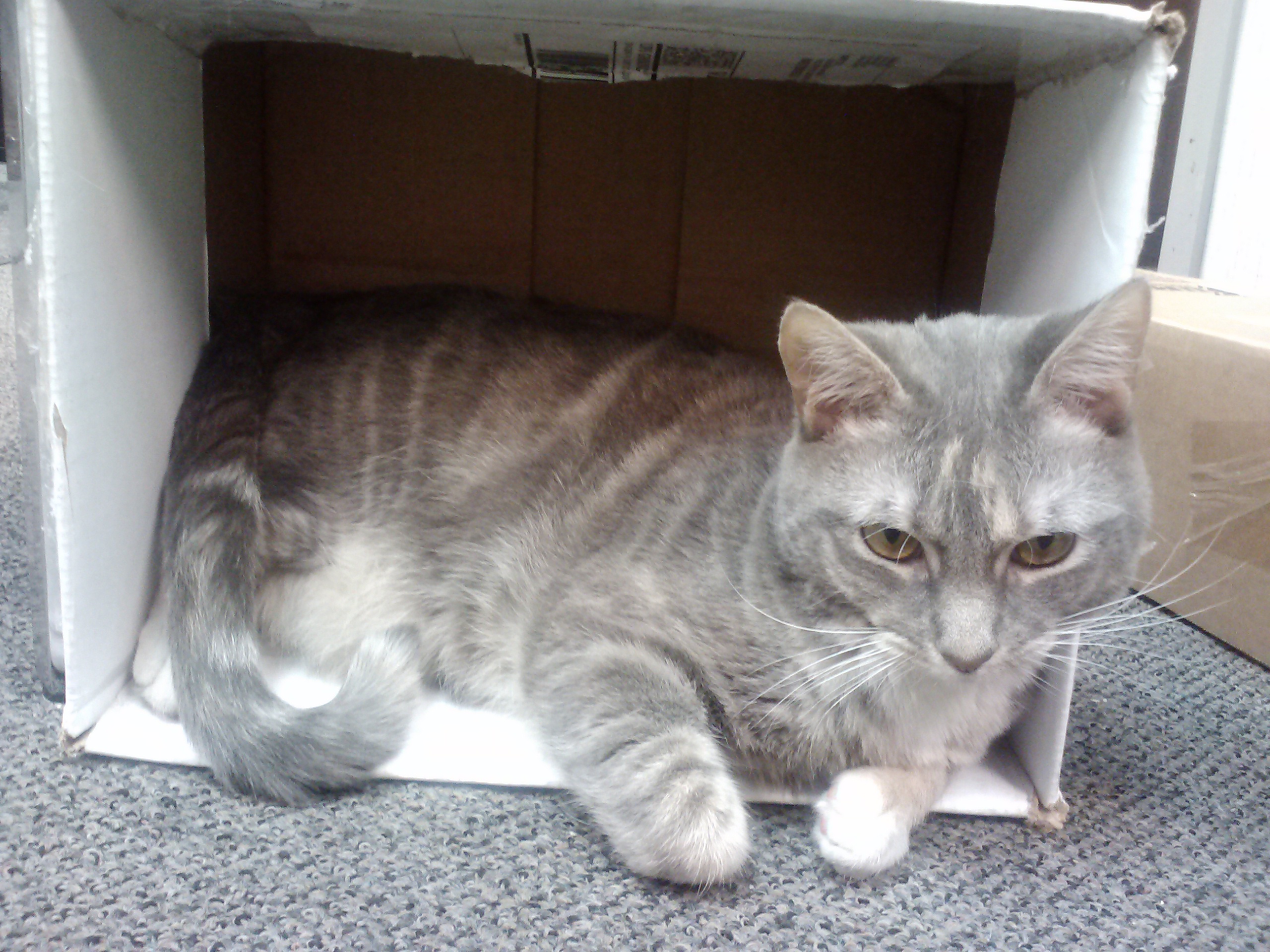 There’s just something about a box that a kitty just can’t resist. And, usually, the smaller the box, the better. (I rushed to take this picture with my cell phone before Gypsy moved, so I apologize for the poor quality.)