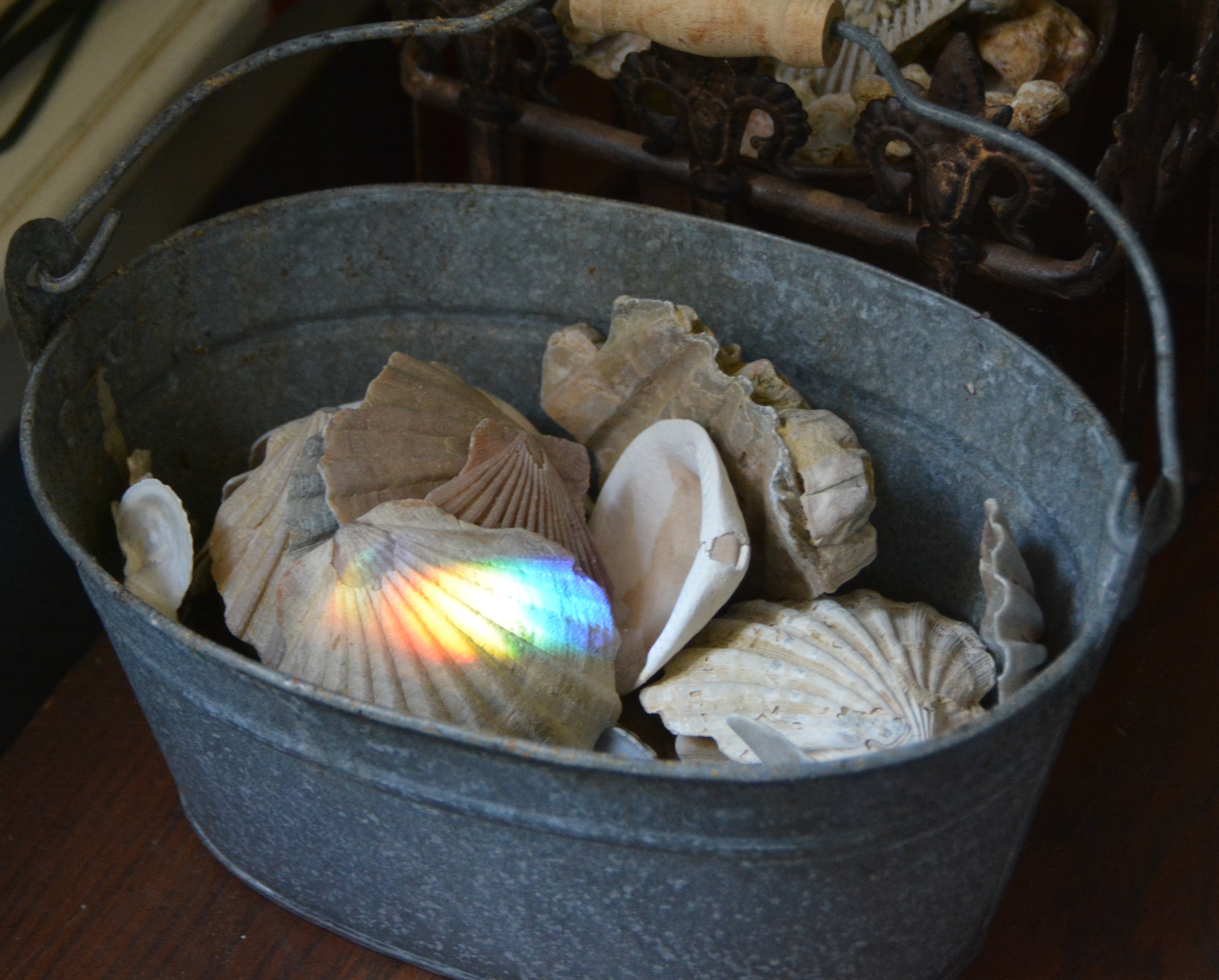1.) Earlier this week, I came in our side garage door and noticed this. I have a bucket of shells on a table just inside the door, and something (I’m not sure what) had created a prism reflecting on one of the shells.