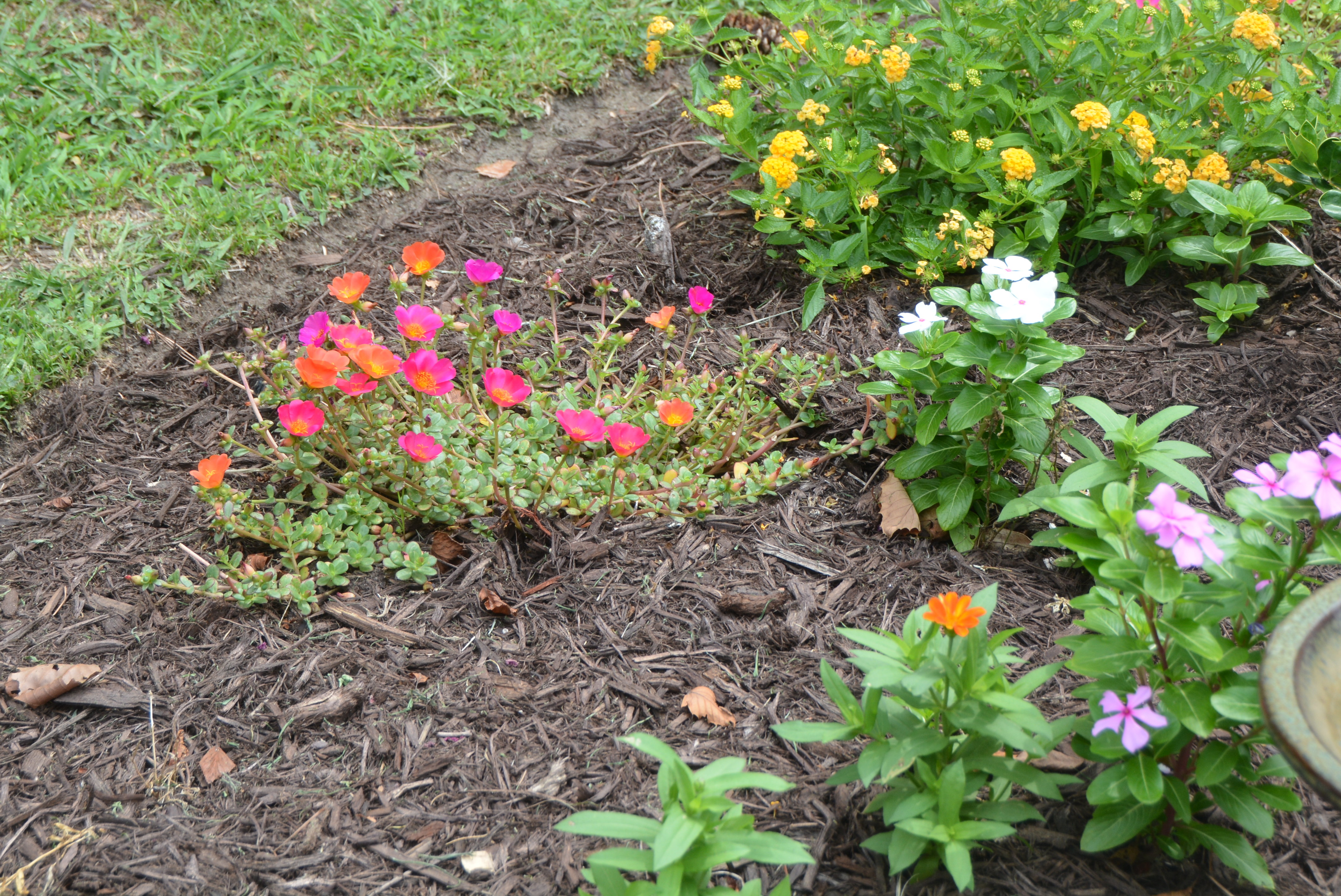 I’d never thought of planting purslane in a flowerbed rather than a container until I saw it at the entrance to a business in town. (The yellow lantana, vinca and zinnia were planted last year; I’m happy they’re back.)
