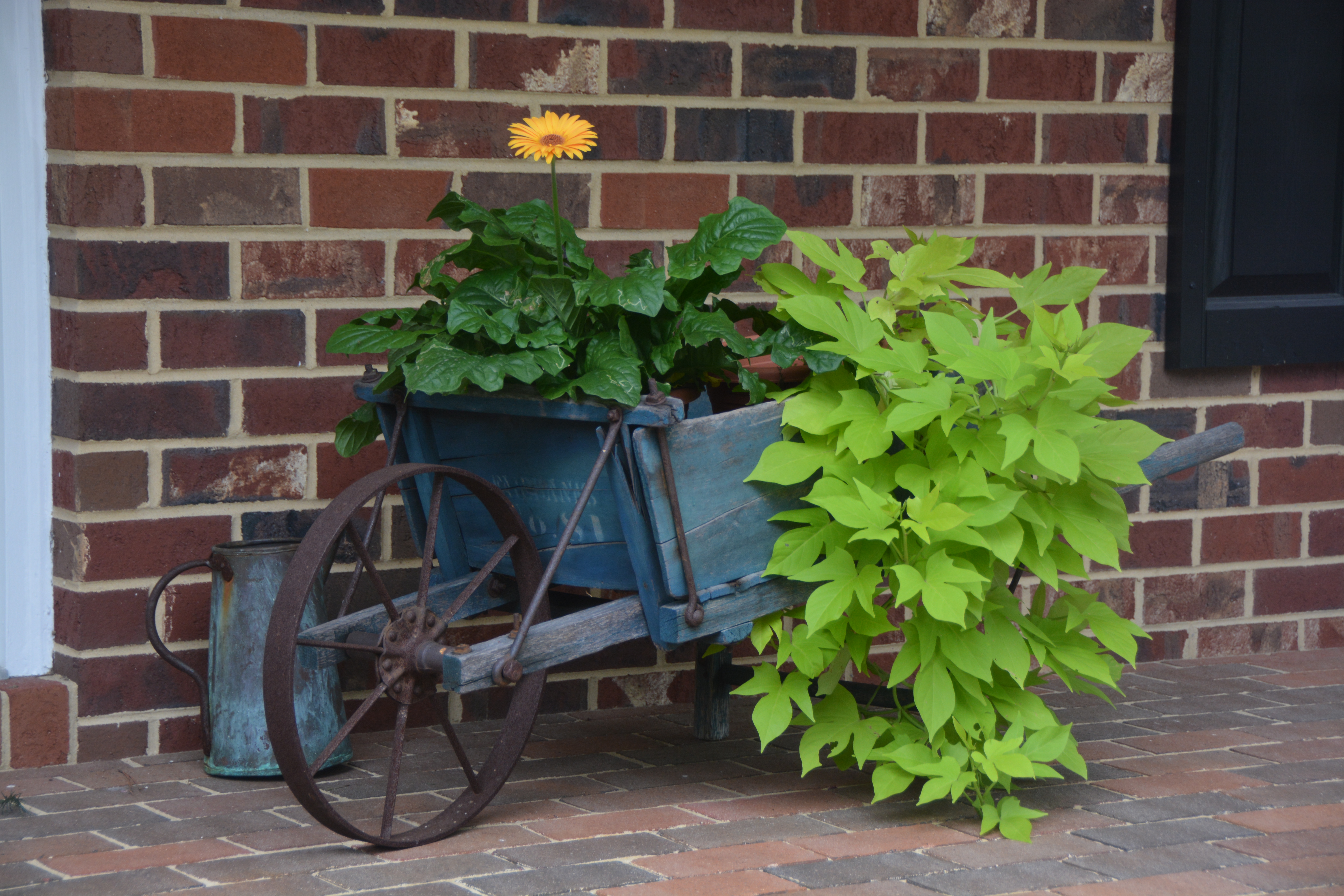 This old wheelbarrow has been a fixture on our front porch for several years. As usual, a sweet potato vine is part of this summer’s display, along with a gerbera daisy, blooming proudly.