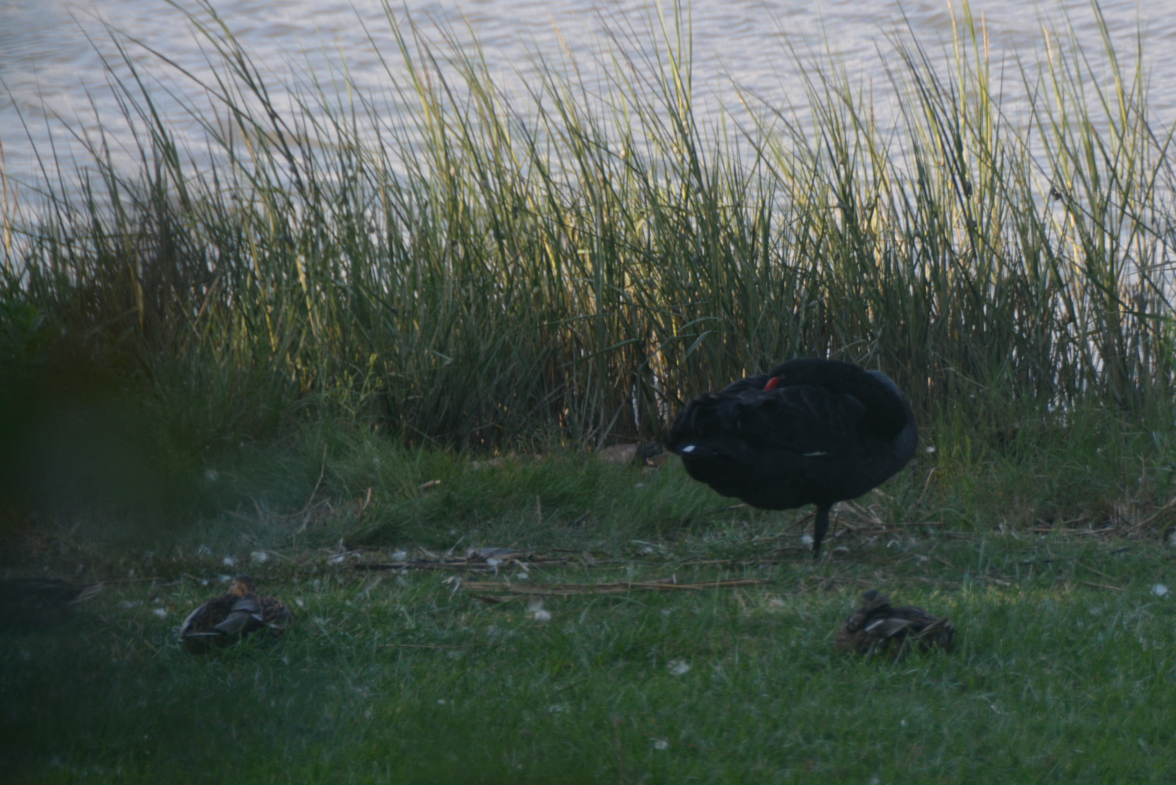 4.) I caught Groom Swan and three ducks sleeping in our yard recently; Groom Swan standing on one leg….impersonating a sea gull, I guess.