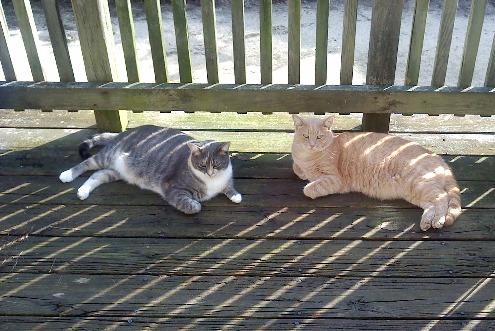 Recently Marshall snapped a photo of the two of them relaxing on the deck: Chessie on the left, Snugg on the right. (Obviously, neither of them has missed any meals.)