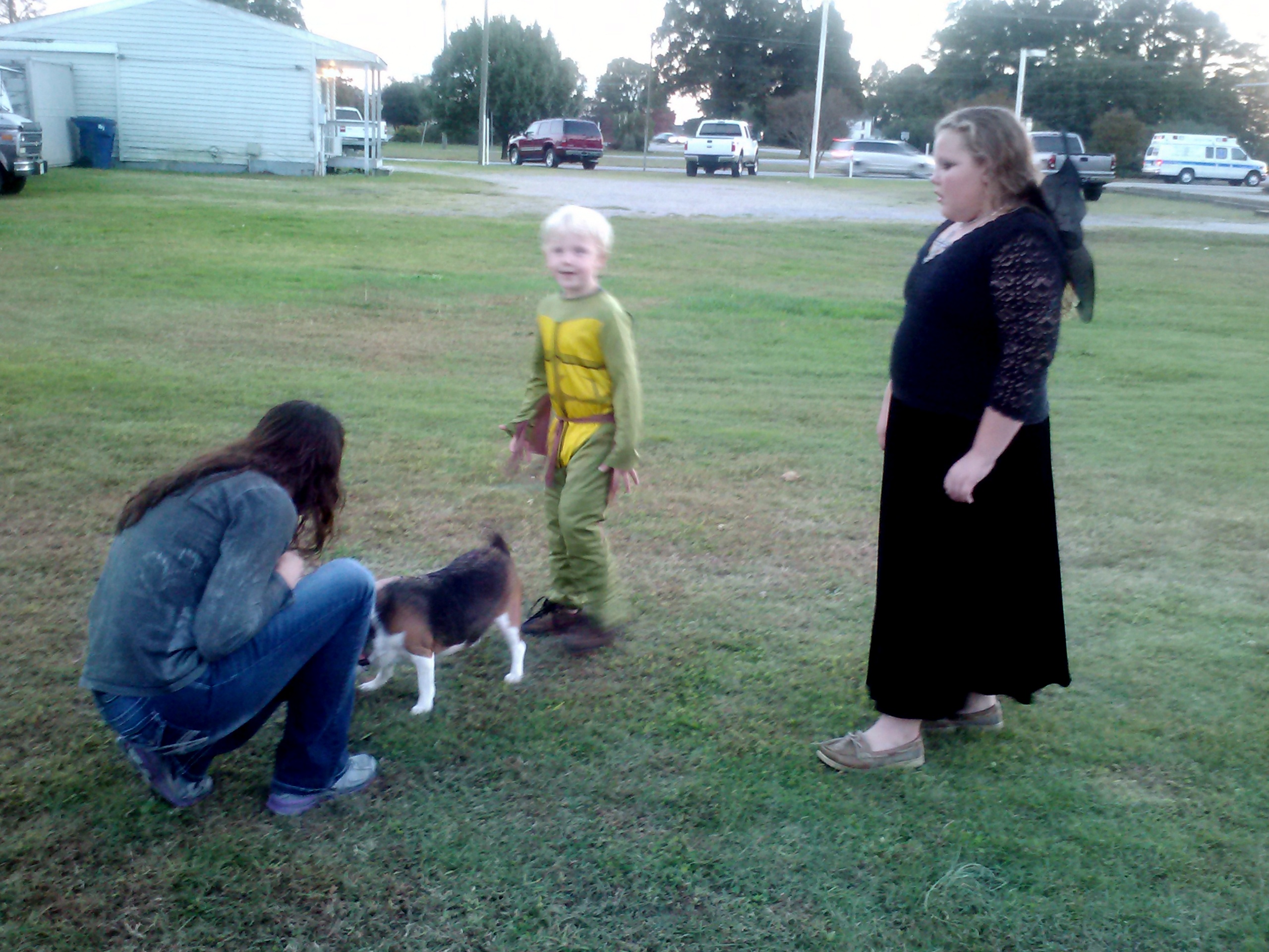 BUT, Bobby was calling to say that the dog’s family was there, looking for her. We were only about a mile away, so we made a quick u-turn, and reunited Daisy with her relieved family. Her human brother and sister were already dressed for trick-or-treating.