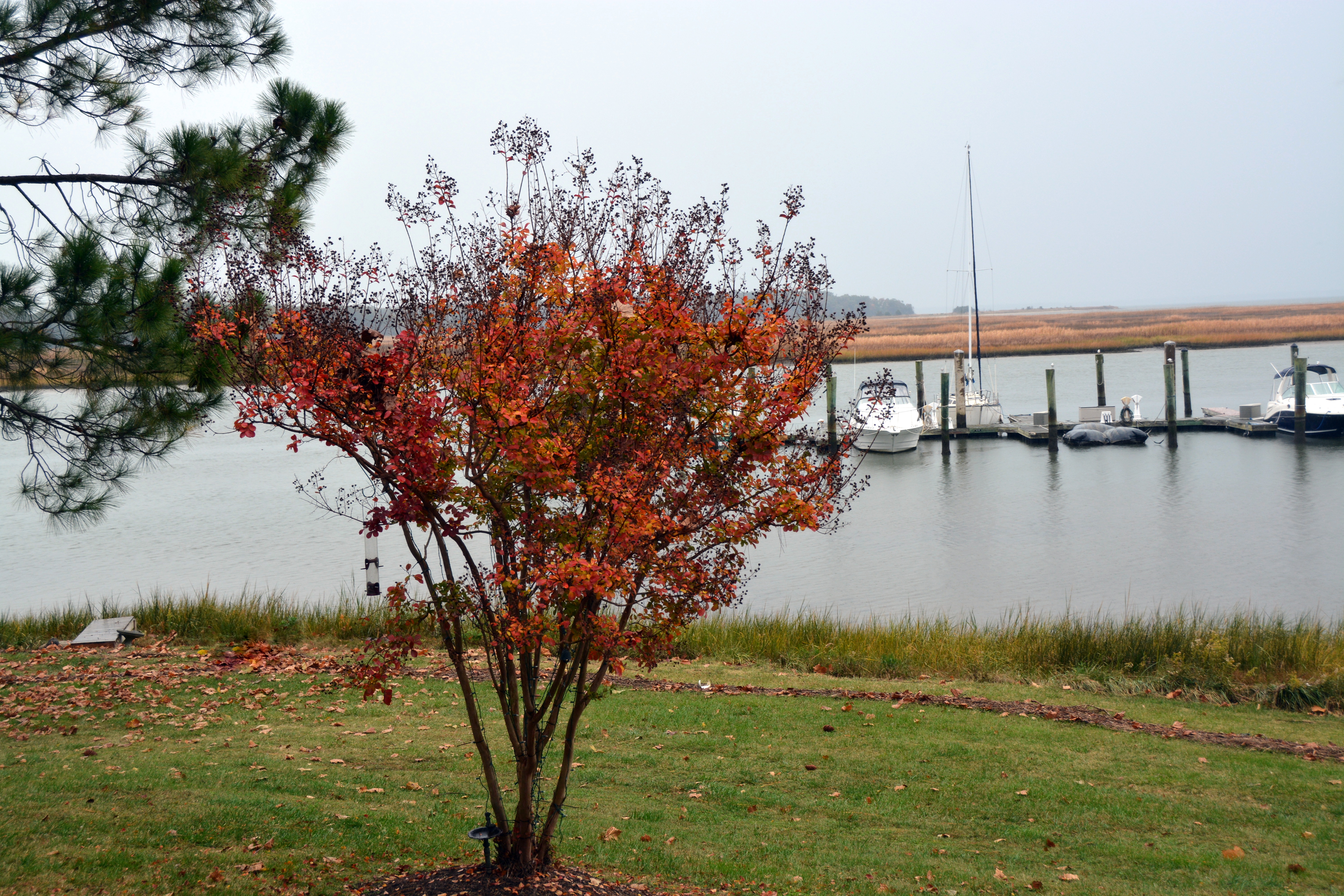 1.) It was a gray, drizzly, breezy day, but our crape myrtle is still providing us with a little color.
