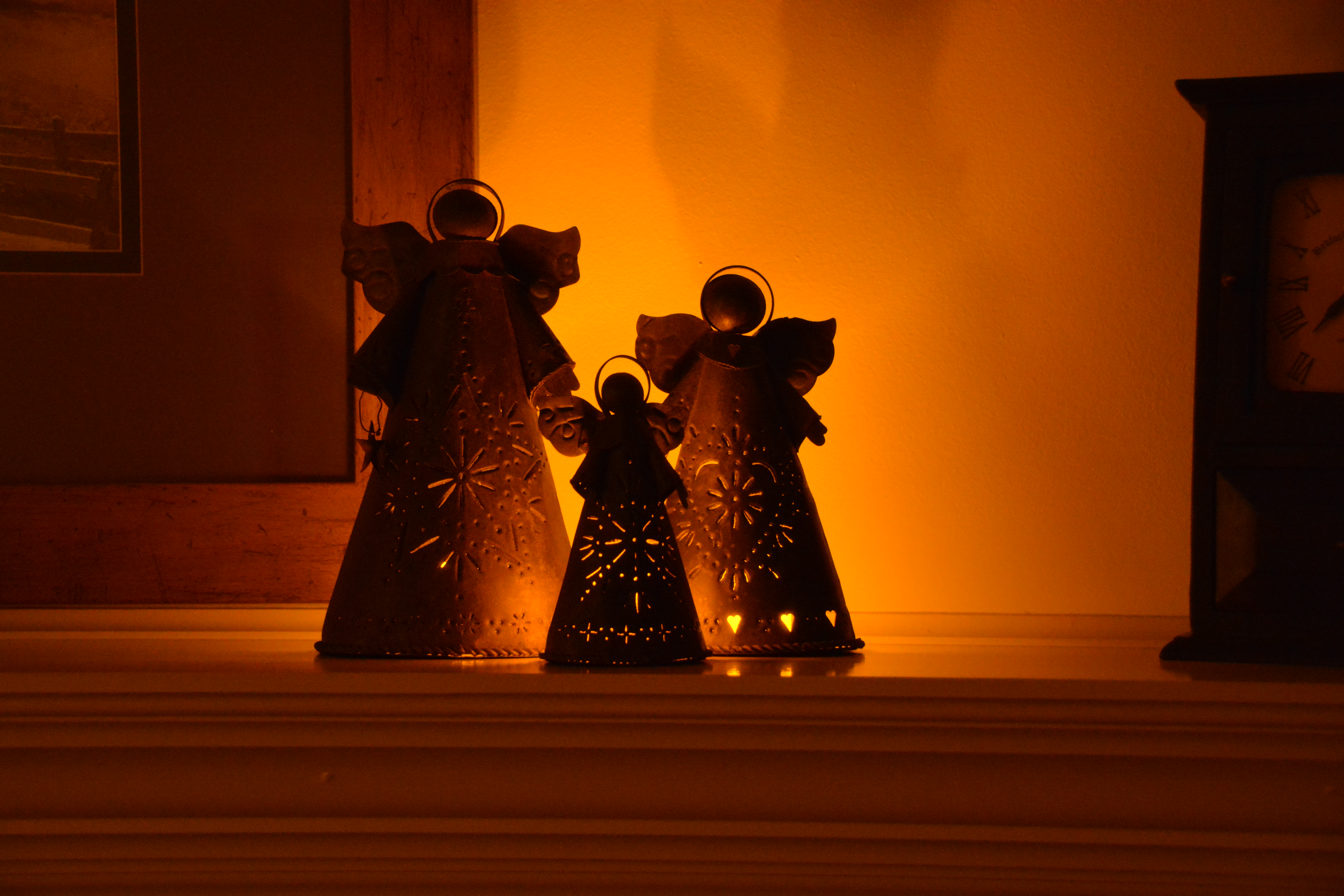 My purchase was this set of three adorable tin angels.  Once home, I placed them on our mantle, with battery operated votives behind each of them.