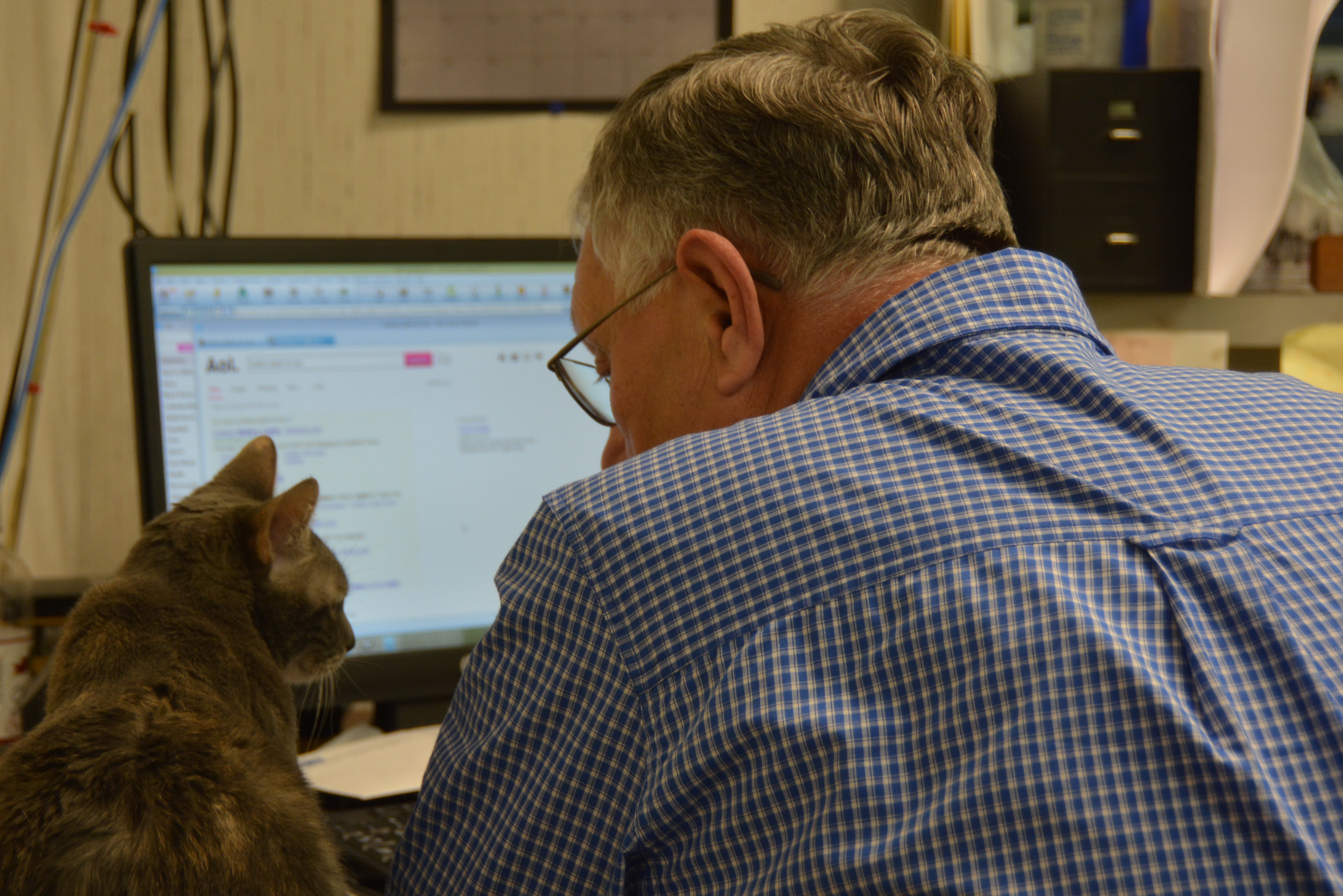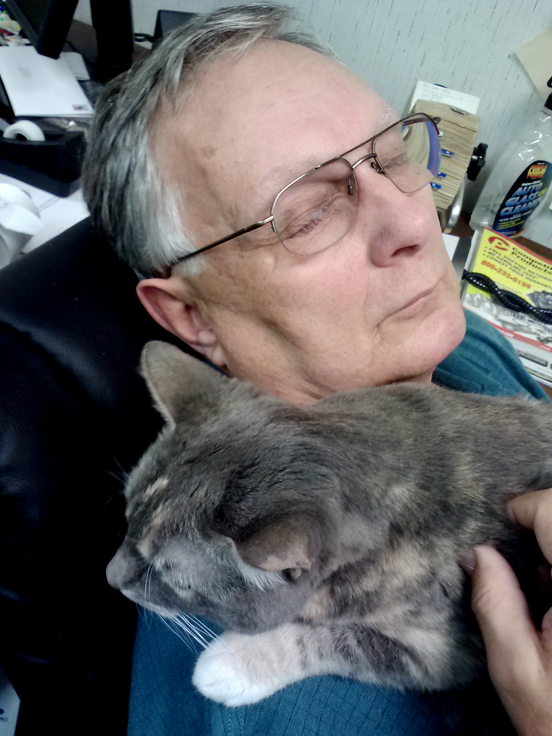 When Motor Man is at his desk, she will sit in front of him until he lies back in his chair, then she moves up on his shoulder. It’s unusual for me to see her there; she usually only does that when he’s at the shop alone. Sometimes, she’ll lie there on his shoulder until he finally moves her. (Has she grown a little since she became our shop kitty?)