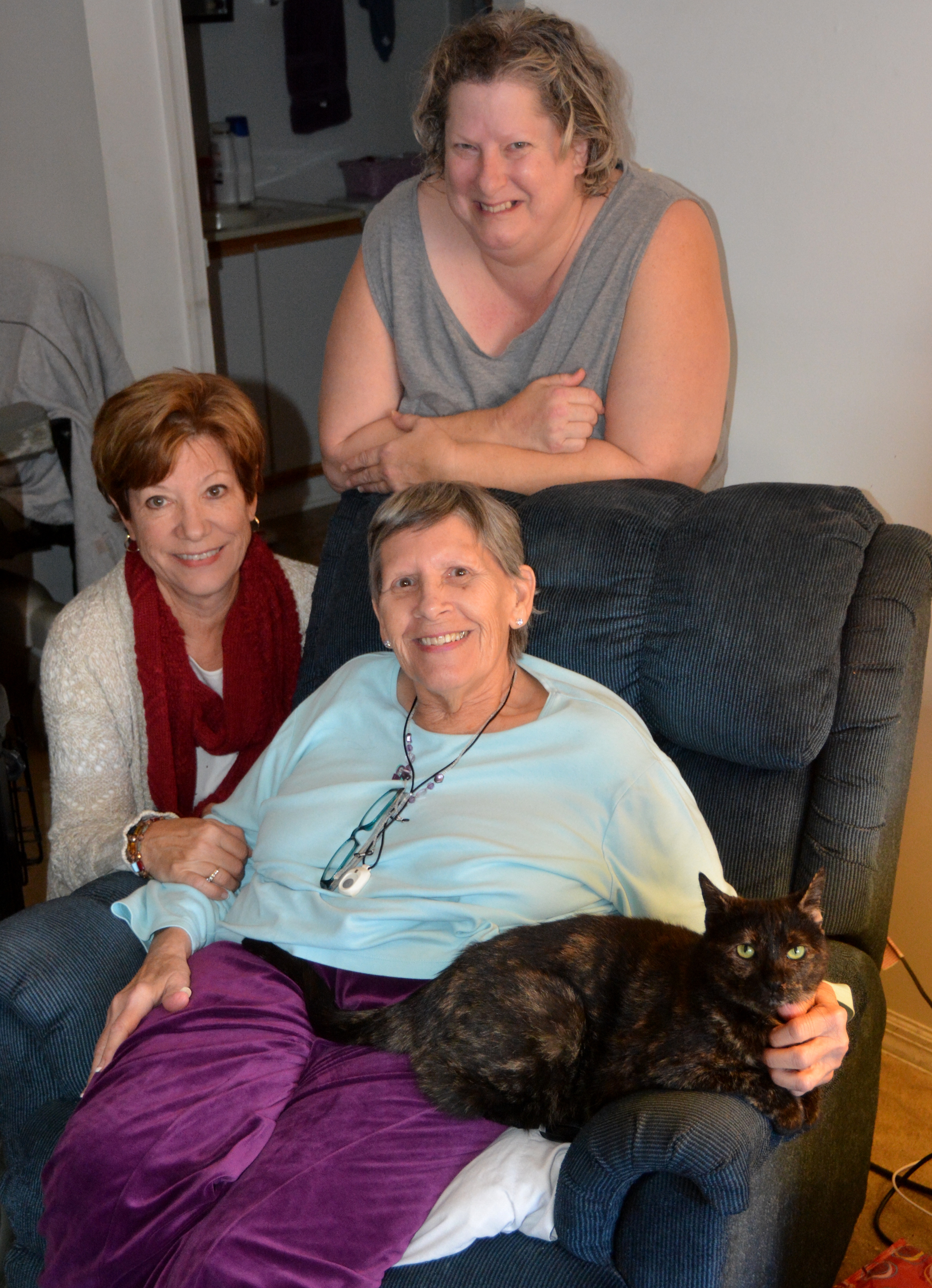 Later, a visit with my sister, June and niece, Barb. June’s kitty, BJ, joined us for a photo. (Actually, we joined her for the photo.)