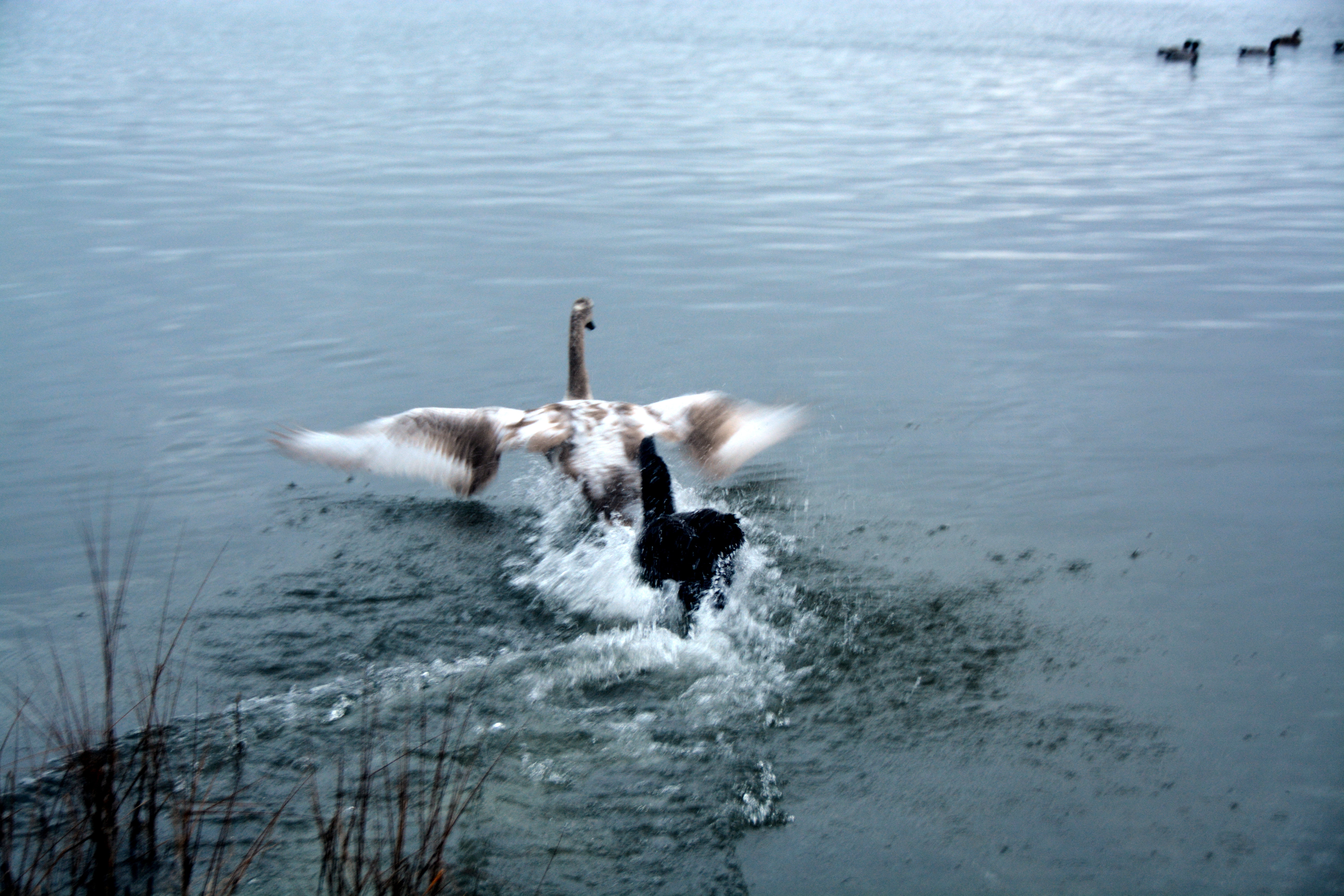 The one who didn’t get the idea, however, was the young swan. Again and again, Groom would chase him to the far end of our yard, and when Groom turned around to come back my way, the “young’un” was right behind him.