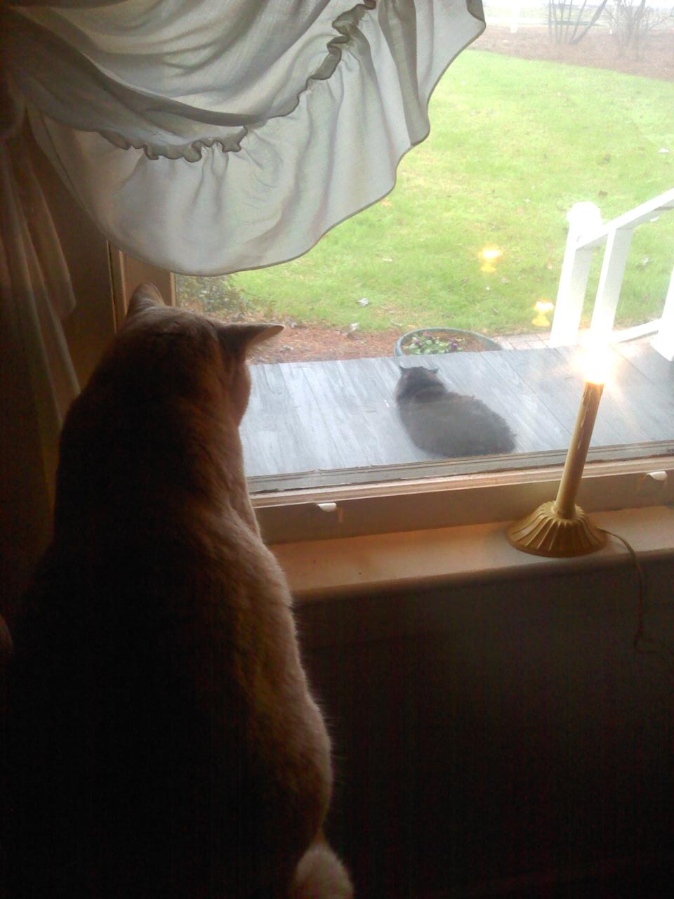 Recently, a neighborhood cat spent some time at Marshall’s, and Snugg didn’t take kindly to the newcomer. (That cat is no longer on the scene; hopefully, he returned home.) Marshall and I thought this was an interesting photo.
