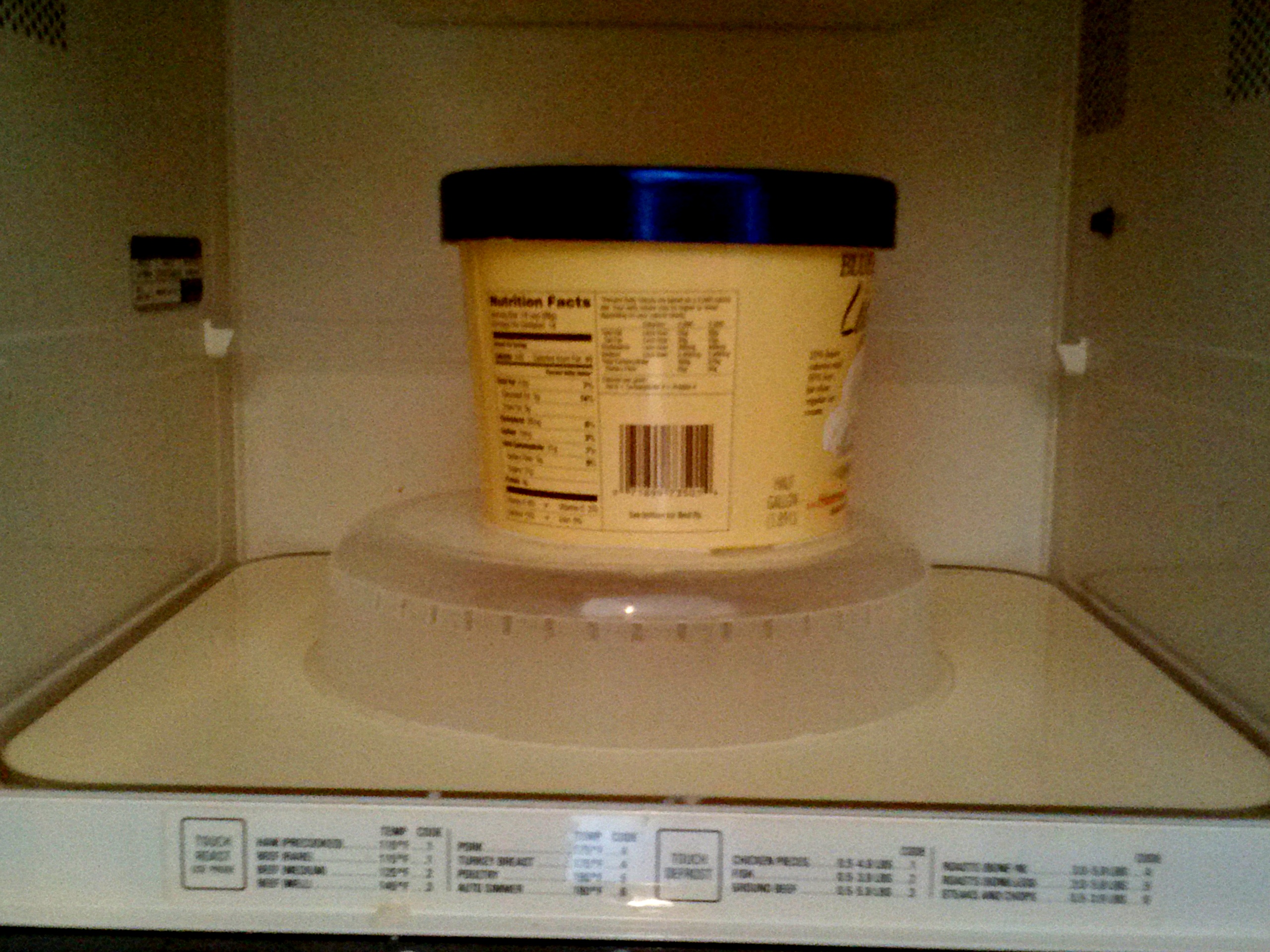 2.) I shared this on my Facebook page earlier this week, but I thought the rest of you might also enjoy a chuckle. We soften our ice cream in the microwave for a few seconds to make scooping it easier. Sunday evening, after dishing up our nightly treat, I mistakenly/absentmindedly put the container (almost an entire half gallon, by the way) back in the microwave, rather than the freezer. I discovered it the next morning. Note all that delicious cream nearly filling the glass tray…. sigh. And thanks to Motor Man for helping clean up THAT.