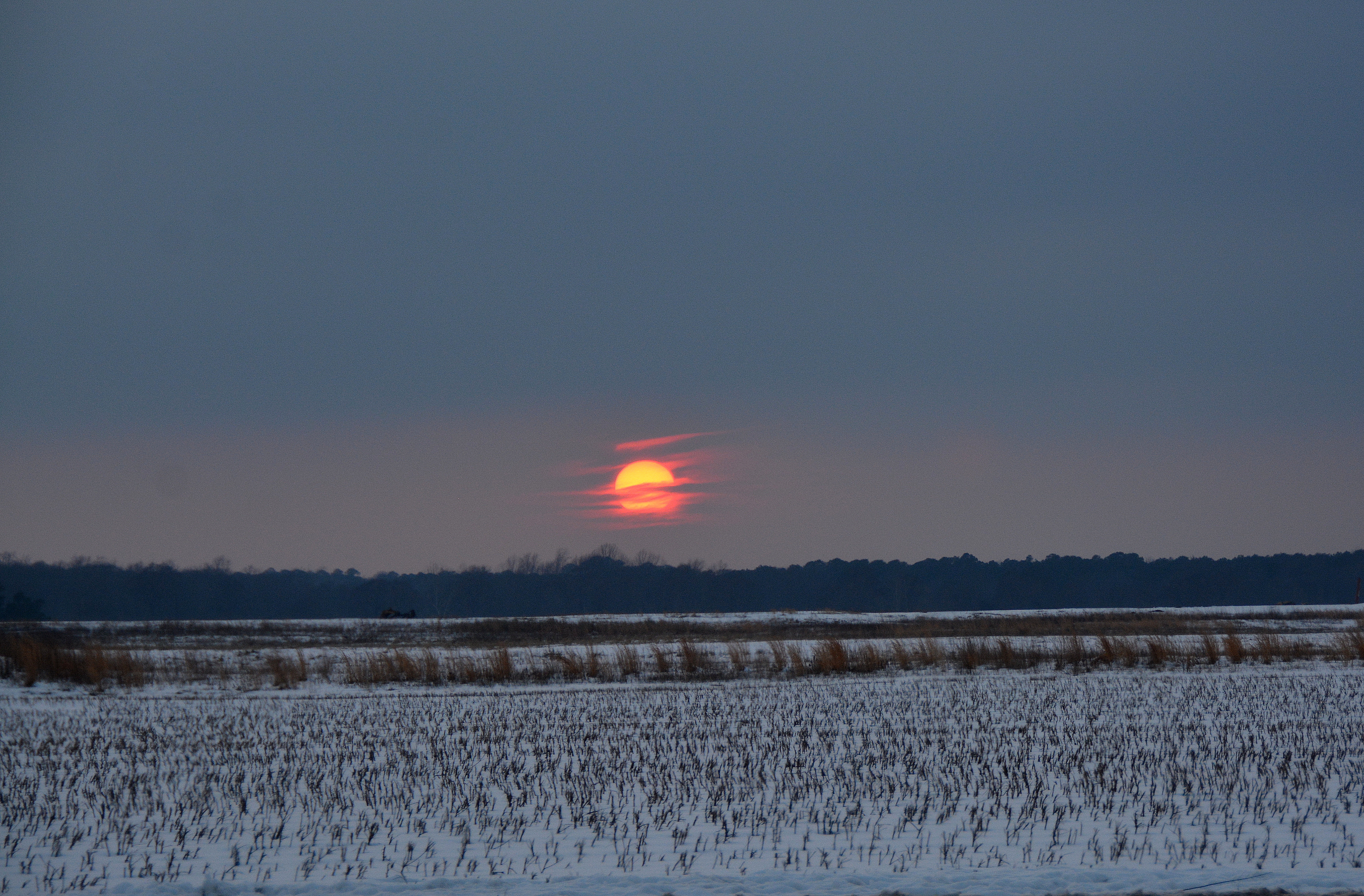 One evening last week, on our way home from dinner, we noticed that the setting sun was a “red rubber ball” (Marshall’s words.)