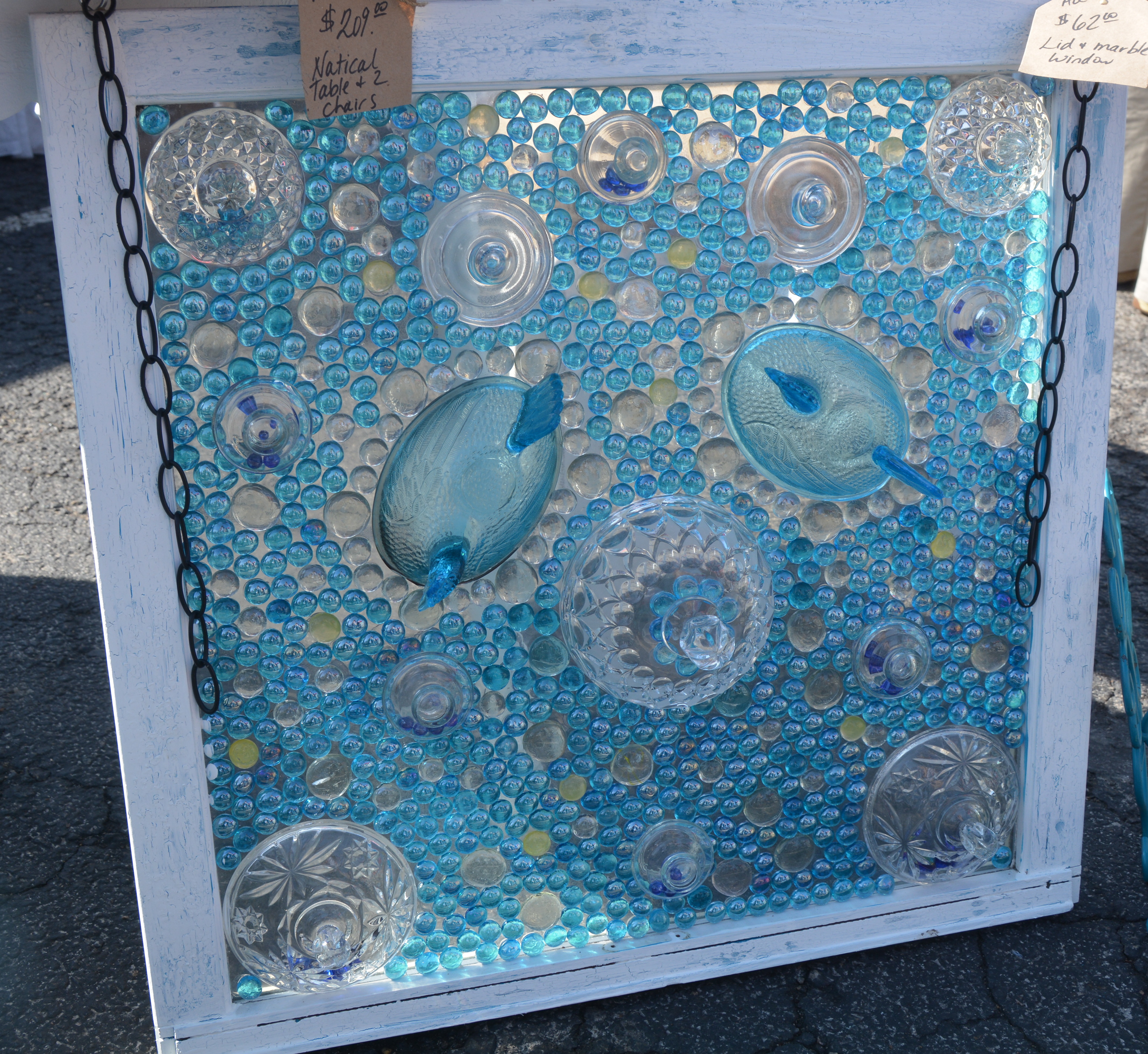 There was much to “catch the eye”;  for instance, this repurposed window, decorated with “marbles” and lids from dishes.