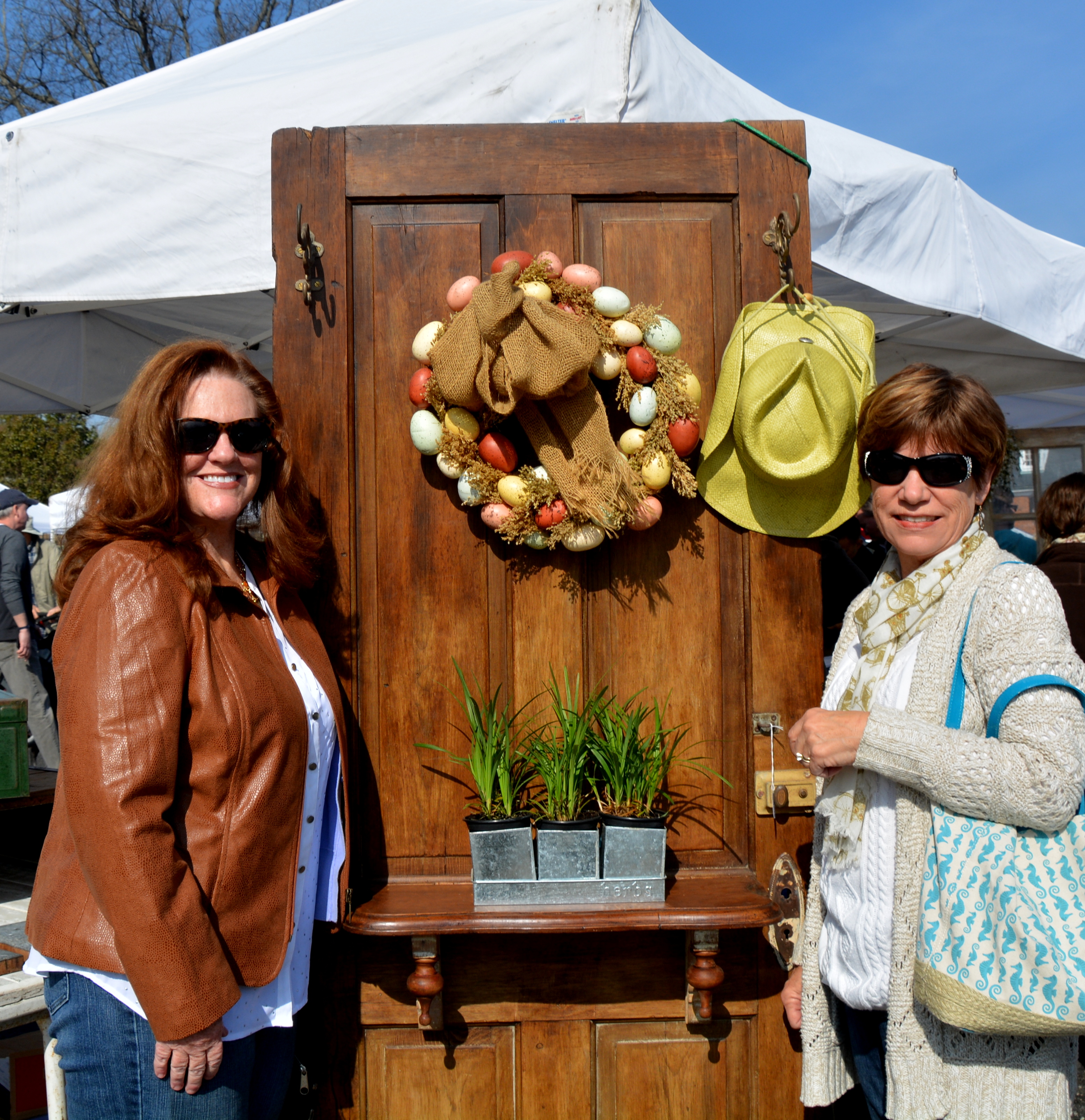 My friend, Donna, and I arrived shortly after the market opened at 10 and found it packed with shoppers. The first booth we saw had delightful vintage architectural elements, such as this beautiful wooden door.  We persuaded a fellow shopper to take our picture.