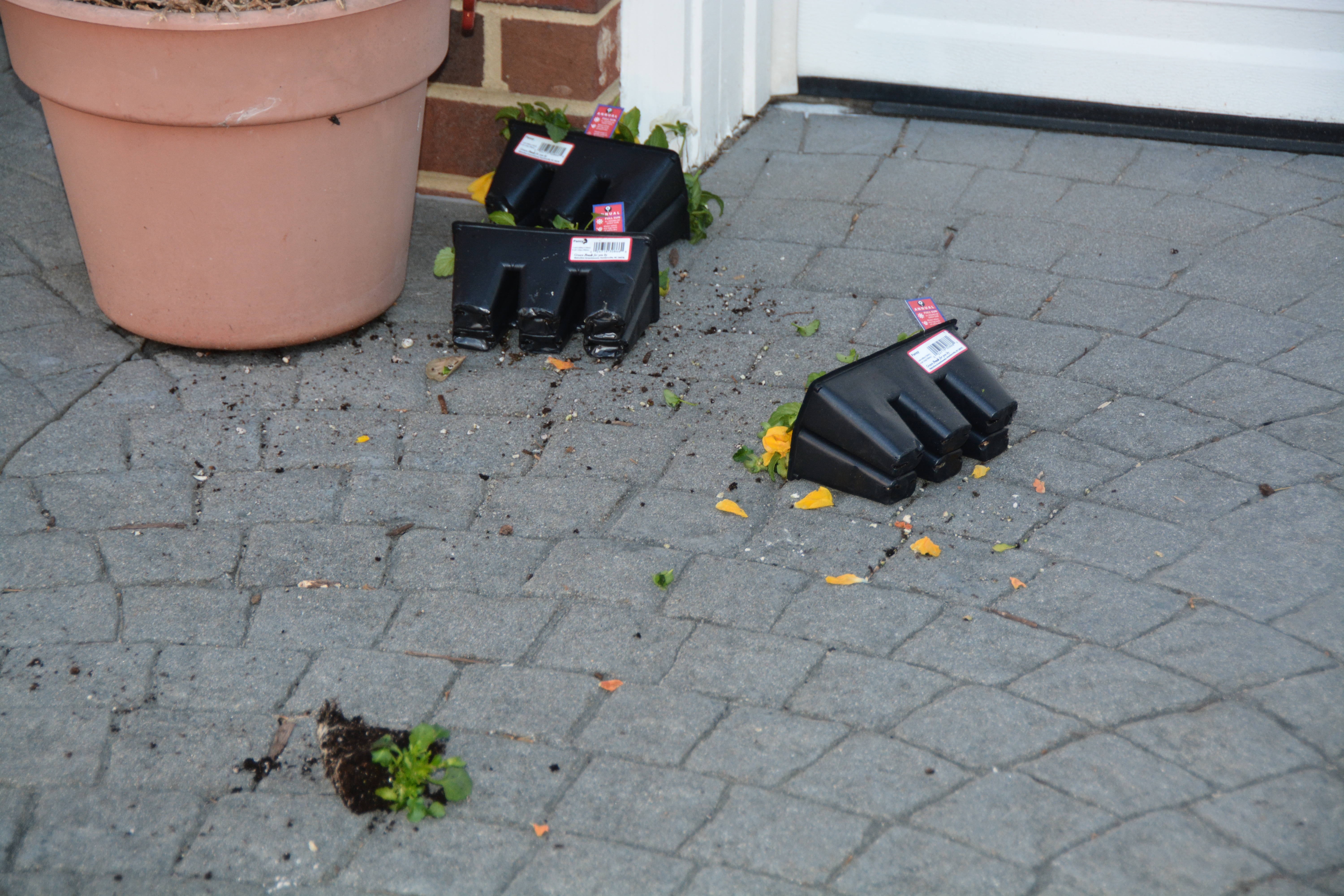 These photos were taken Monday evening when Motor Man and I returned home from dinner. We noticed a few deer out in the yard, but as we came into the driveway, we saw this: three packets of pansies that I hadn’t yet gotten around to planting.