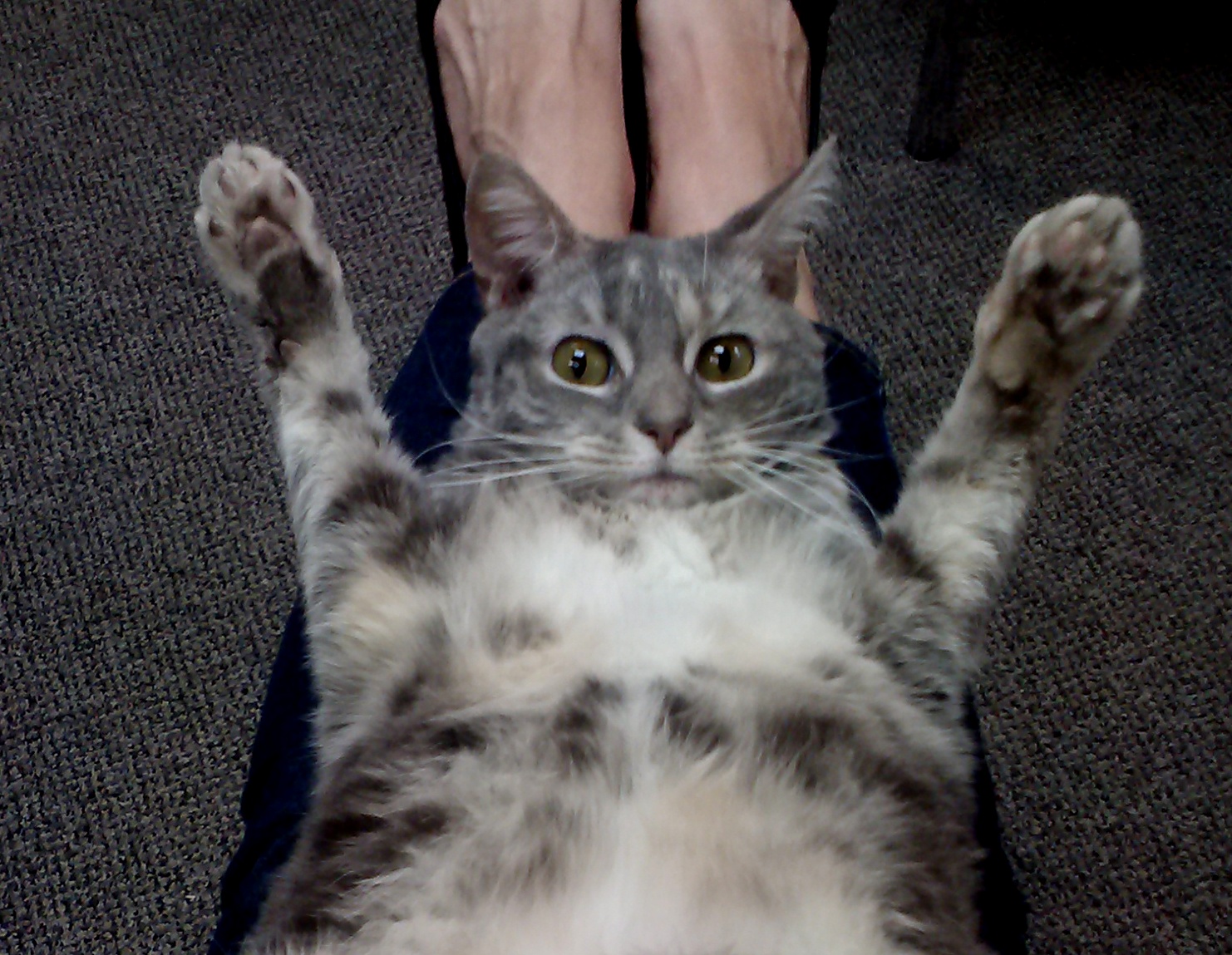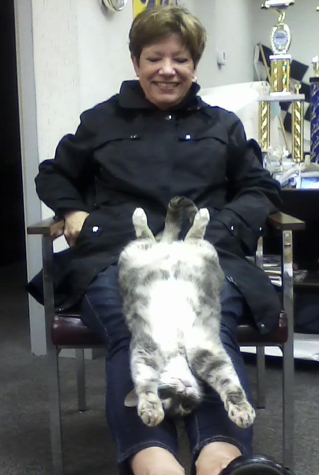 She had jumped in my lap and curled around to get comfy. Then she turned on her back with her head hanging over my knees. I wondered what she would do if I stretched out my legs. She was completely content, so Motor Man took a picture with his cell phone. (It was a rainy day, and we were only at the shop for a few minutes, thus my rain coat.)