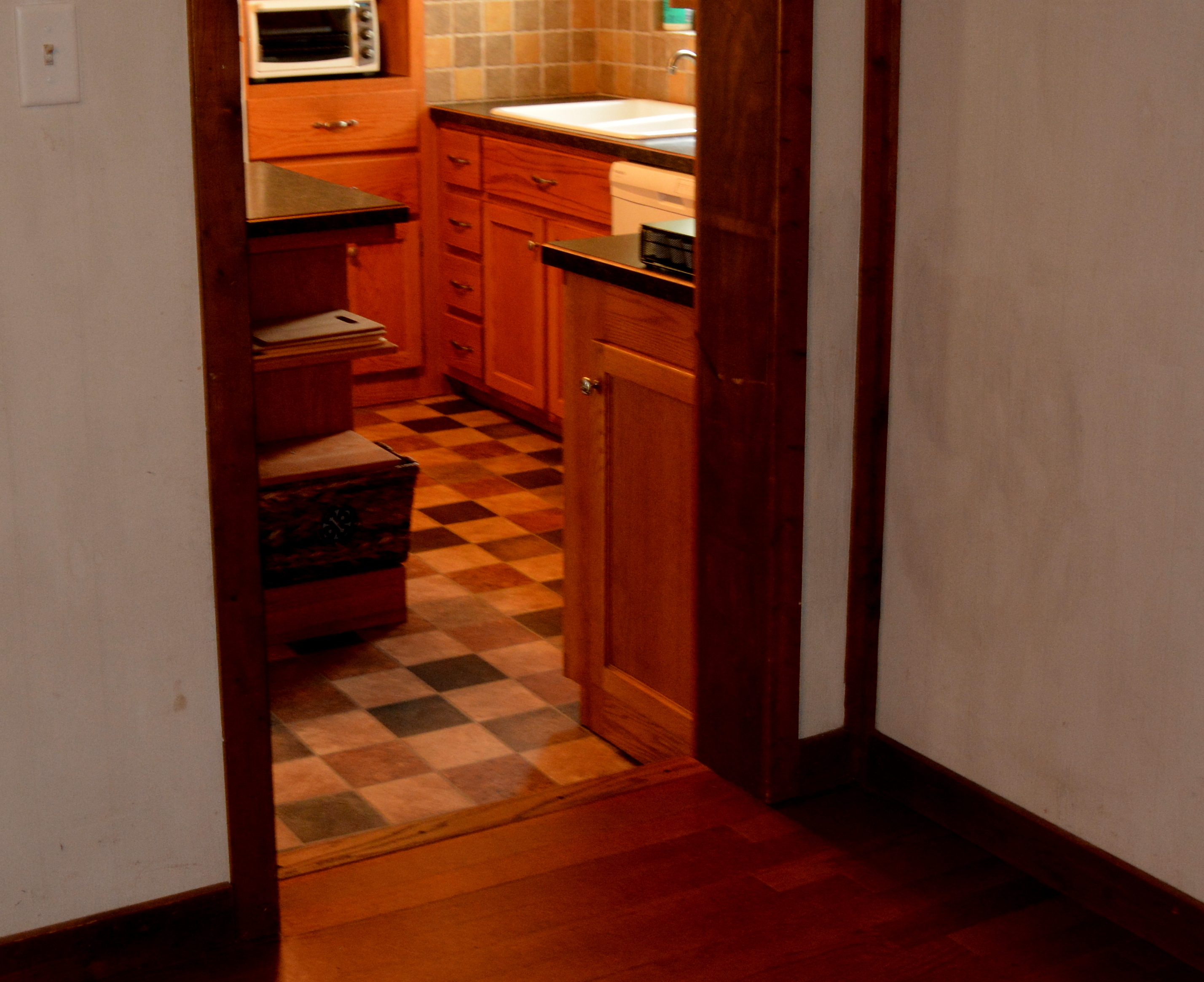 It’s difficult to see in this picture, but there is a step where the hardwood floor meets the tile. The kitchen had been added on to the house years after it was built.