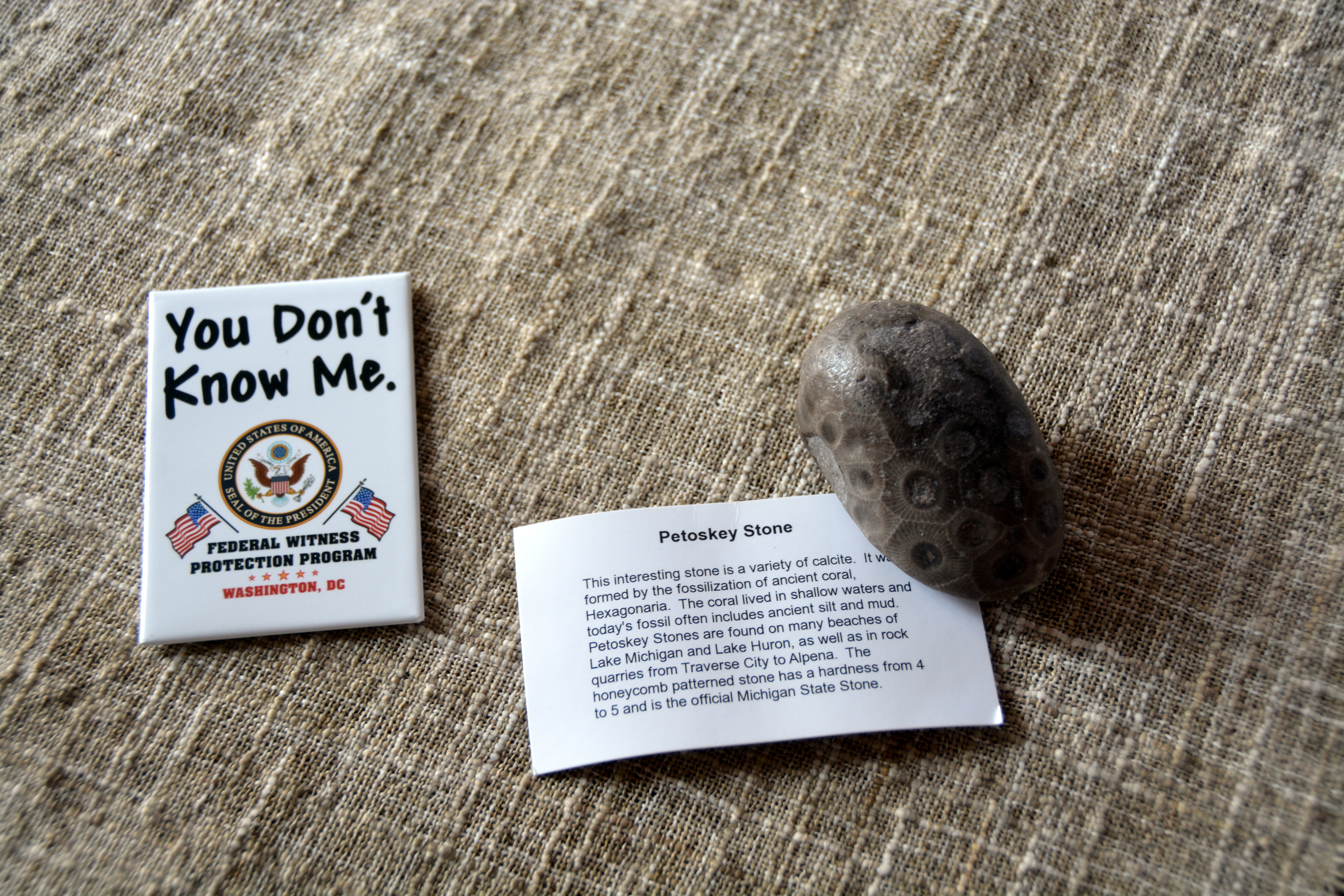 We exchanged gifts: she had a funny DC magnet for Motor Man and a Petoskey Stone for me.   You should be able to enlarge the photo if necessary to read about it, but those stones are made of fossilized coral and are found on the beaches of Lake Michigan and Lake Huron. (Definitely not something I’d find on my nearby shelling trips.)