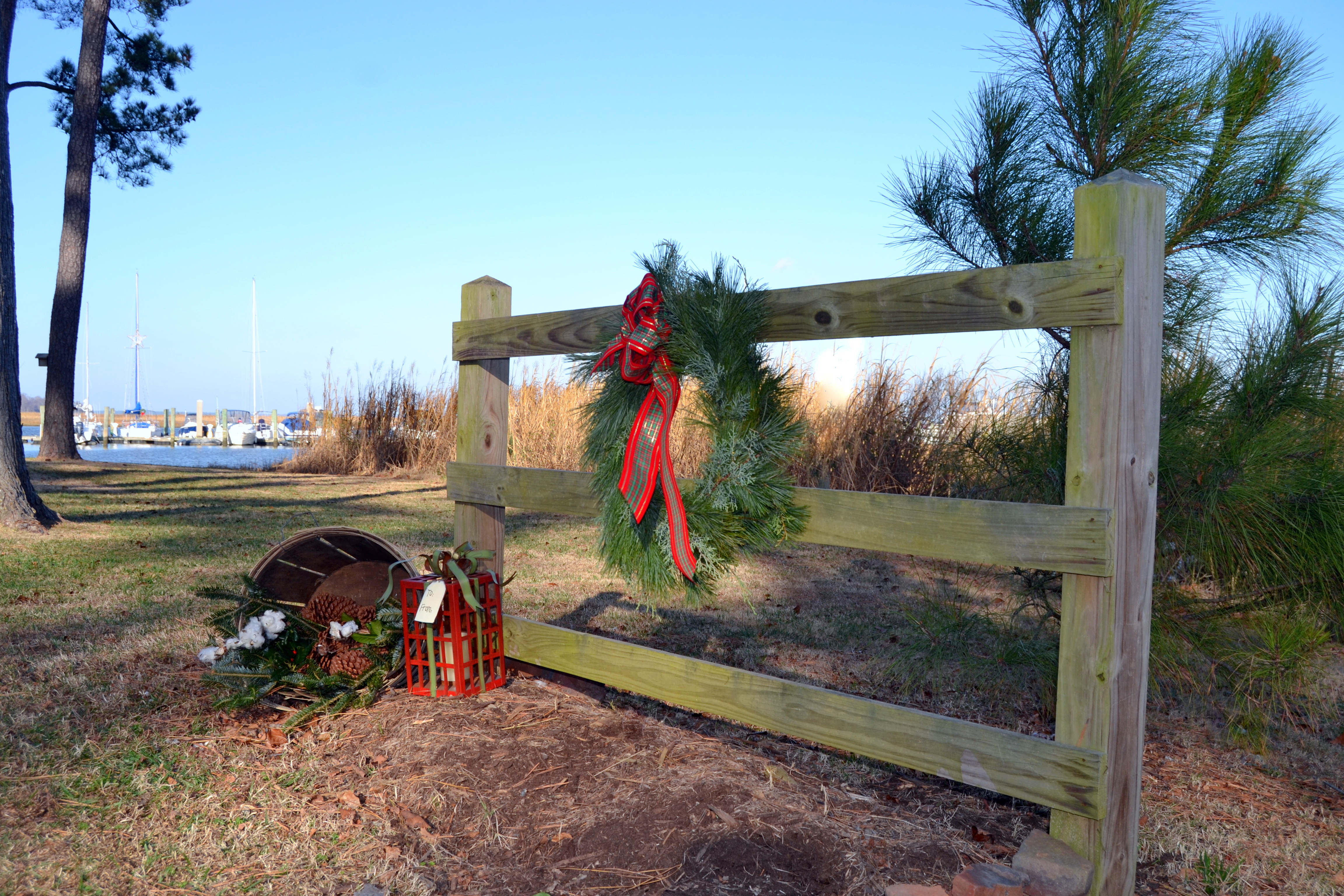 This photo shows the “other” side of our yard from where I take pictures of the sunsets and the old boat. (By the way, the old boat is fine: the tide wasn’t high enough to affect her.) In the background is a little inlet, which is normally marsh and not filled with water.