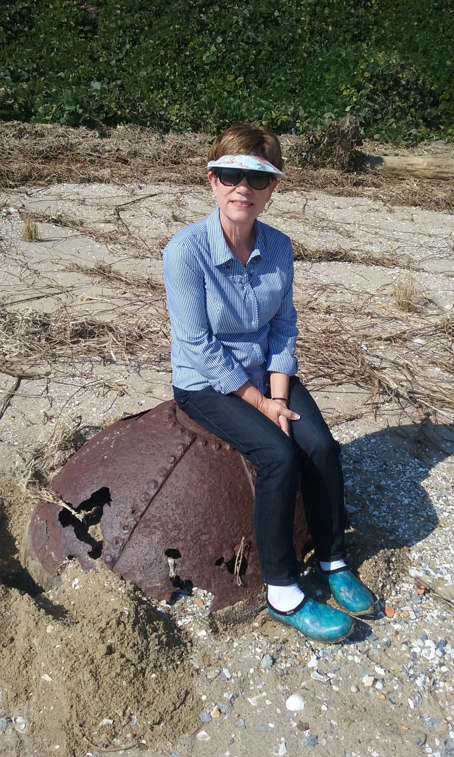 2.) Since beach-combing is supposed to be exceptionally good following a nor’easter/hurricane, my friend and I went in search of treasure Wednesday afternoon.  We saw quite a bit of changes in the beach since the storm. And there was a relic there that we didn’t recall seeing before.  I took a photo and showed it to Motor Man when we got home. He decided that he’d like to see it in person, so we did that yesterday. We spoke to the property owner and learned that it’s an old steel buoy from a boat building business in that area not long after the turn of the century. Hurricane Isabel moved about 500 feet from its original location. We aren’t sure why we haven’t noticed it before. (Please  pardon my footwear: those are my beach-combing shoes. As for the white socks, well, there’s just no excuse….  I didn’t realize there was going to be a photo shoot.)