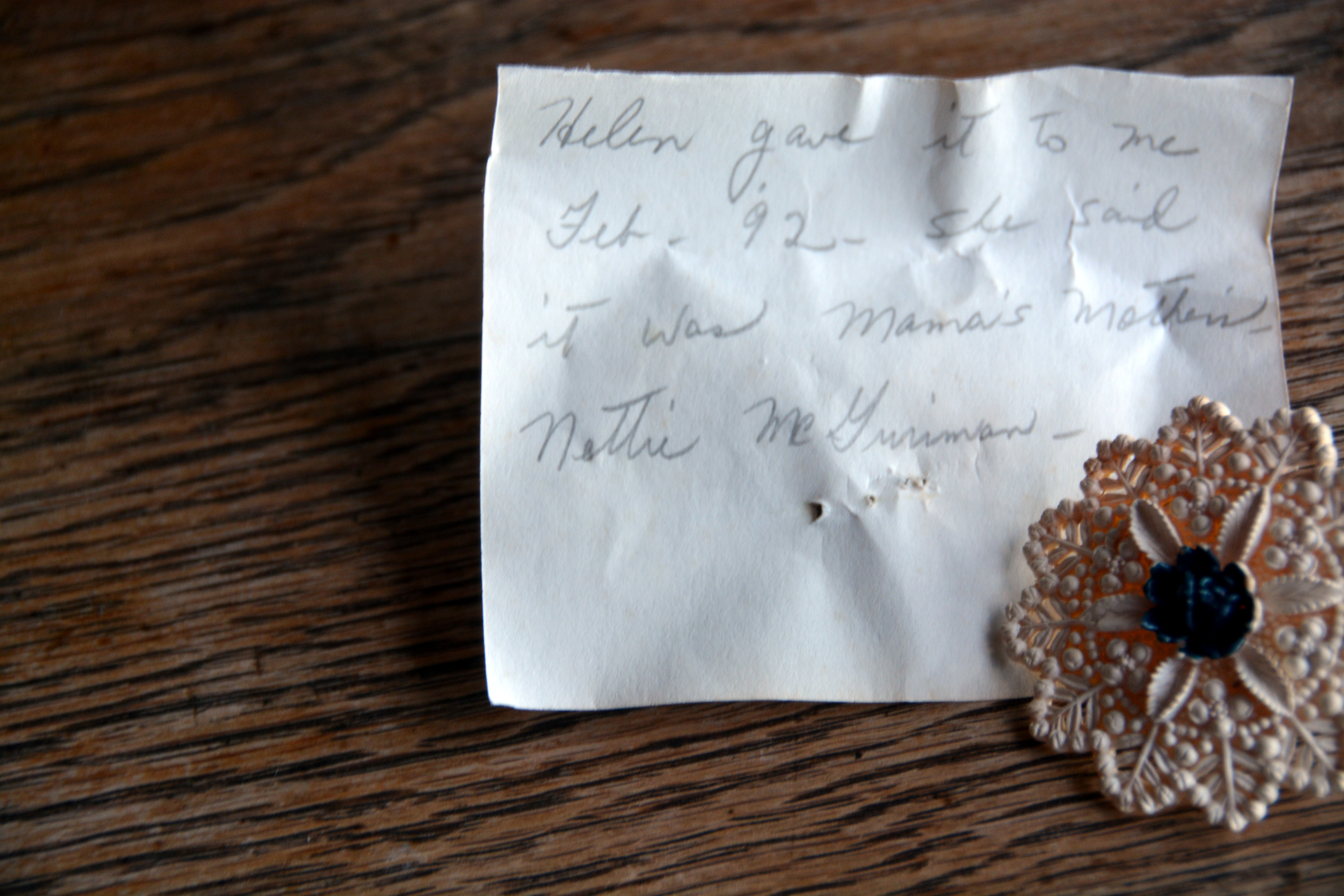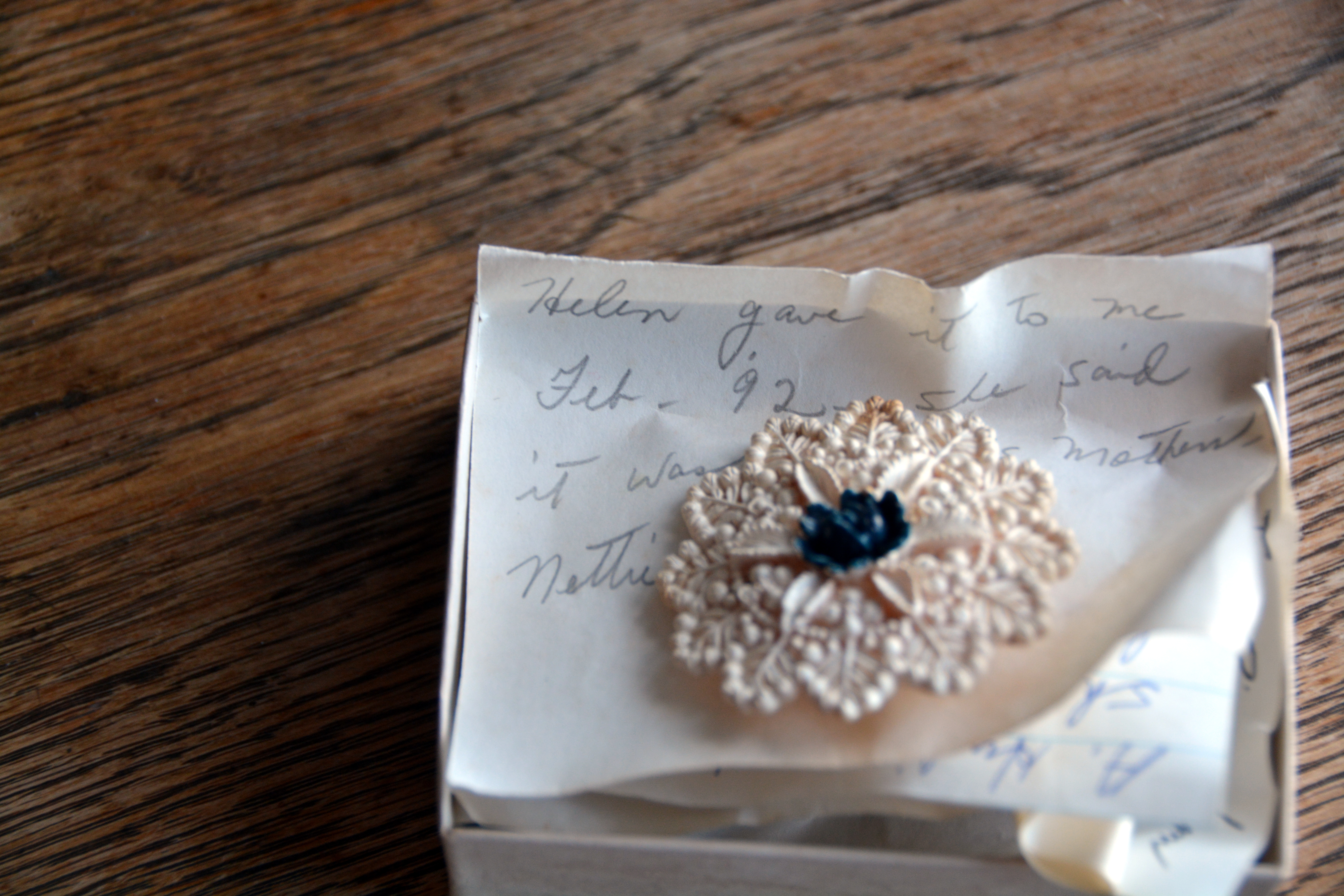 Rather than auction the entire showcase at once (which was my fear), we were told by the auctioneer to choose whatever items we were interested in, and we could bid on those.  I was the only bidder for this little box, which I didn’t really examine before buying. Inside were three pins, but I was brought to tears when I could actually read what was written on the note on top.